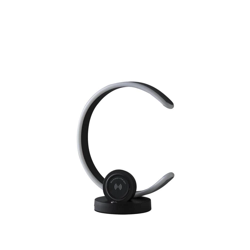 Ultra Modern Curve C Shape Matte Black LED table lamps offer a combination of decorative and task lighting that is ideal for a variety of commercial and residential spaces. In addition to their portability and utility, This modern table lamp is loved because the range of style options offer something for everyone. This Lamp uses an integrated LED technology for long-lasting, bright illumination intended to use an LED table lamp in a commercial or home office, table lamps with USB port and a wireless charger are a good choice featuring handy ports that allow you to illuminate your space while simultaneously charging devices your smartphones and a USB port for your tablet and other electronic devices. Modern table lamps not only add function to a space but also add aesthetic value and help otherwise non-descript space feel more personal. This LED table lamp with its portability, mid-sized can easily be transported from room to room. It features a unique, half looping design that will draw the eye and provide an all-encompassing glow of light to living rooms and bedrooms alike. A round piece of aluminum base has been placed with a touch dimmer button offering a contemporary and intriguing design that merges cutting edge technology with clean, functional design and modern sensibilities.