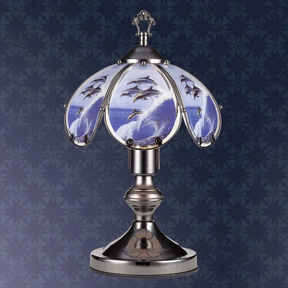Offering the modern convenience of touch-on lighting, this Mini Insync Jumping Dolphins Black Chrome Touch Lamp will complete your style and allows you to showcase your personality in your home. Features a single Light Table Metal Base with a metal pumpkin robust scallop edge shade to complete your decor and meet your lighting needs. 3-way reliable touch sensor control features let you adjust the light you need with just a touch of your hand. No more trying to find the switch in a dark room, this lamp is always ready for your touch. Simply touch any metal surface and you will put this lamp through Its paces of low-medium-high-off. Use a single level light bulb, no need to use a 3-way bulb.