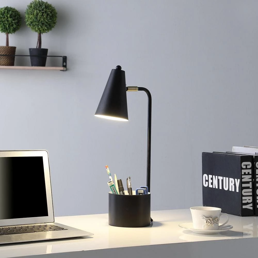 Style and functionality meet with this organizer black desk metal lamp, It is beautifully finished and comes equipped to hold many of the important essentials needed in a desk organizer. The flexible cone shade allows you to point the light exactly where you need it. Instantly illuminate your work space with this Organizer Black Task Lamp, This compact desk lamp provides a convenient place to store your pens, sticky notes or anything else you want to keep within reach. ON/OFF rotary switch is located on the black cord for accessibility and convenience. Organizer includes 4 compartments for storing pens, pencils, paper clips, etc. Just place this table lamp on your work or study table to create an inviting look in your living space. Perfect for office, kids room, or college dorm.