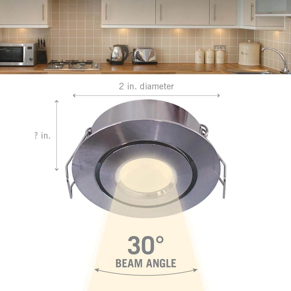 This bright, 2 in. low-voltage LED light uses only 3-Watt, making it a great solution for installations where a slim profile, recessed spotlight is required. Integrated diffuser softens the light and eliminates glare on adjacent surfaces. Requires a 12-Volt DC power supply.