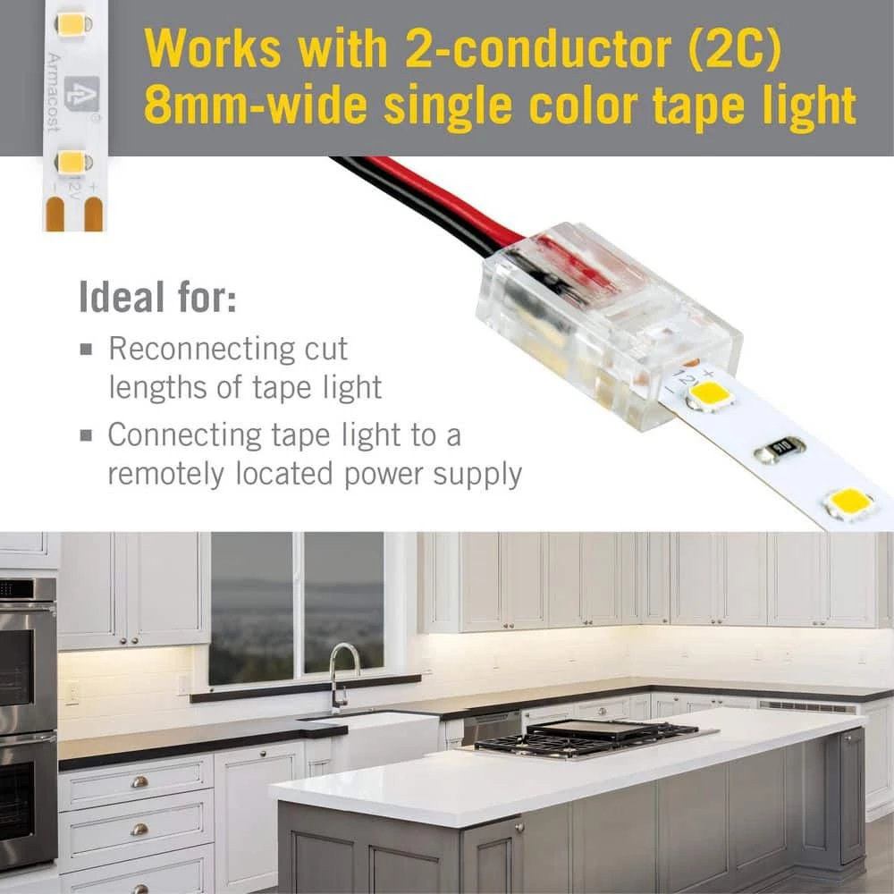 The newly improved 2 Pin Wire to Tape Splice Connectors from Arm cost Lighting are the most efficient way to connect 2 sections of LED tape light into 1 continuous strip. Now with designated channels for wire insertion, installing the connectors is quick and easy. Bridge gaps or create custom-length LED strip lights without soldering or wire stripping. 2C White/Single Color Connectors are used for single color, 8 mm LED tape lighting. Compatible with both indoor and outdoor RibbonFlex circuits.