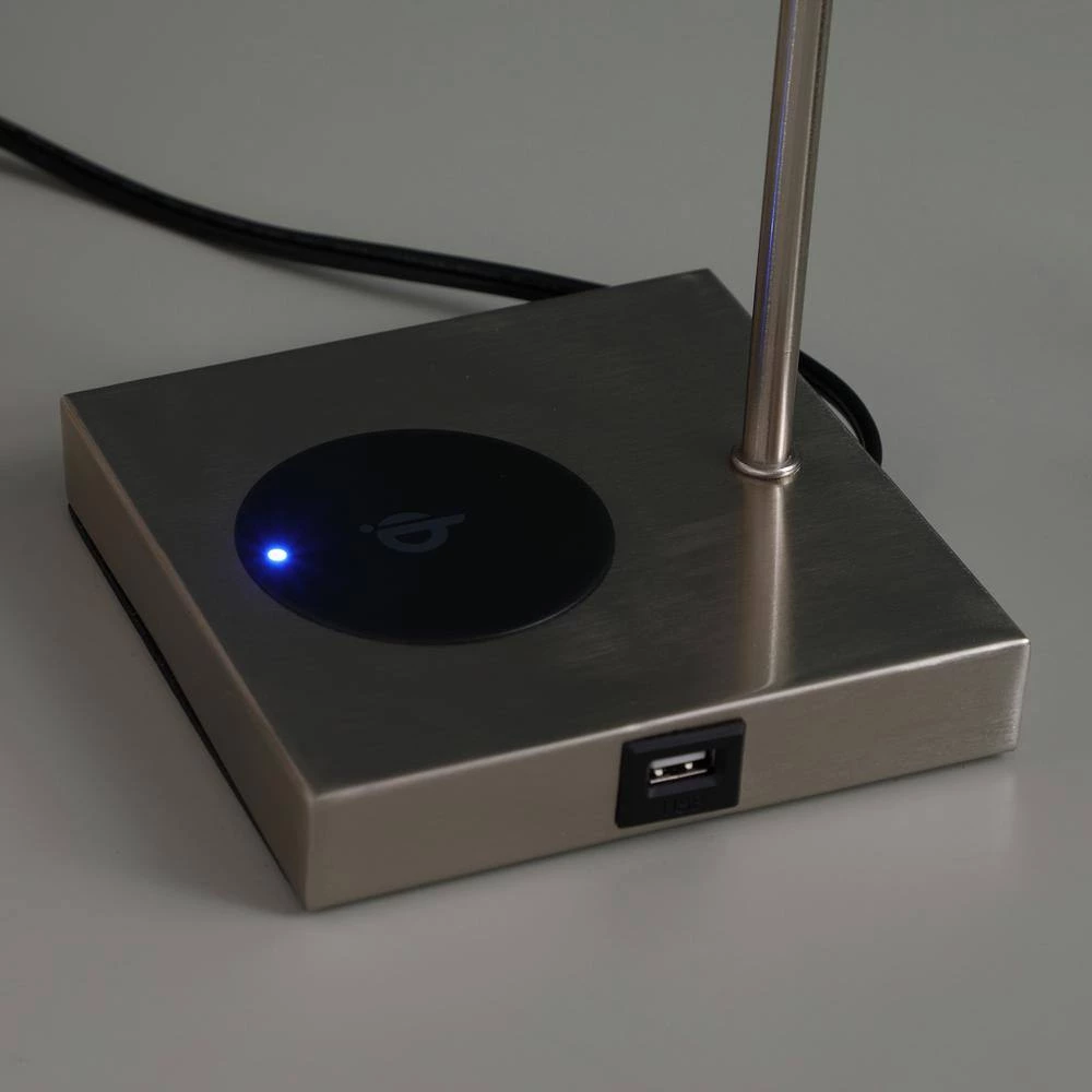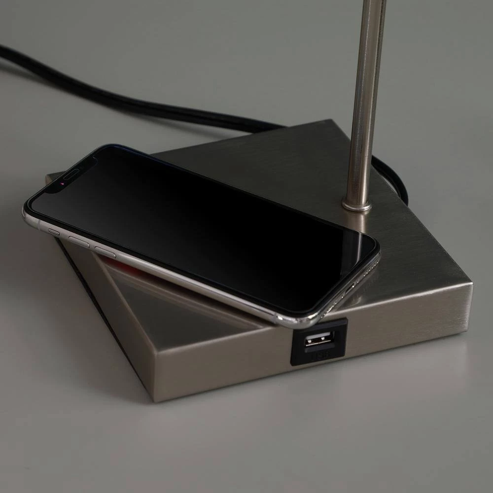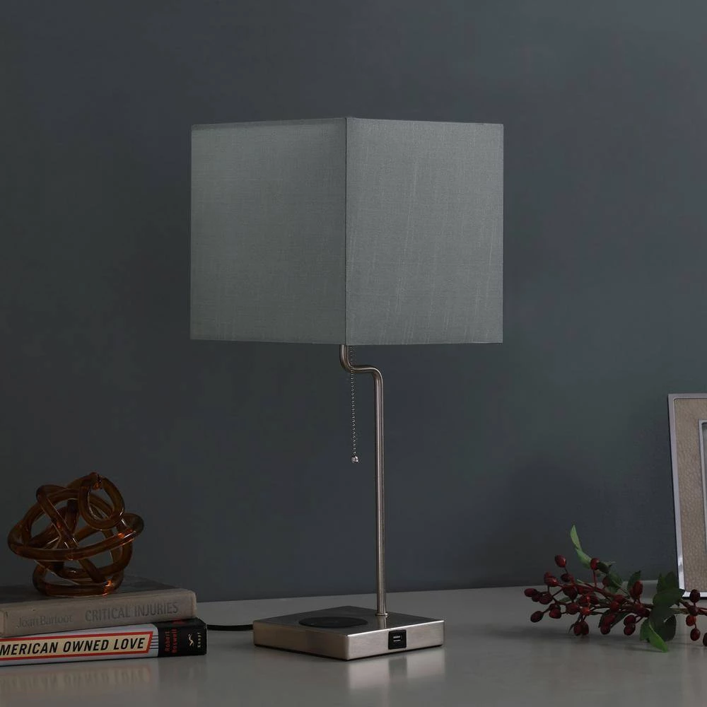 Modern Ashton Square Table lamp feature a Wireless Charging Pad with Qi Technology and a USB port for convenient charging. With Qi integrated into many smartphones, charging is easier than ever-no charging blocks or cords required. Design a workspace or reading nook that’s primed for productivity, you can charge up without cords or clutter. An elegant and practical solution: This lamp does not have the glare of overhead lights or exposed bulbs as its neutral linen shade softens the light giving your room a warm ambient glow. The unique modern style and size of this lamp makes it the perfect bedside table, office lamp or living room side table lamp. Contemporary design and features a metal construction with a top with a Blue Green Textured Square Drum shade. Convenient Pull Chain: With the stylish pull chain, you can turn ON/OFF with the pull chain. No need to find the switch on the cord when you are going to sleep. Super convenient for your bedroom. The charging port and pad function regardless of whether the lamp is on or off. Add this table lamps to your bedroom, office or living room for a dash of delightful symmetry and visual allure.