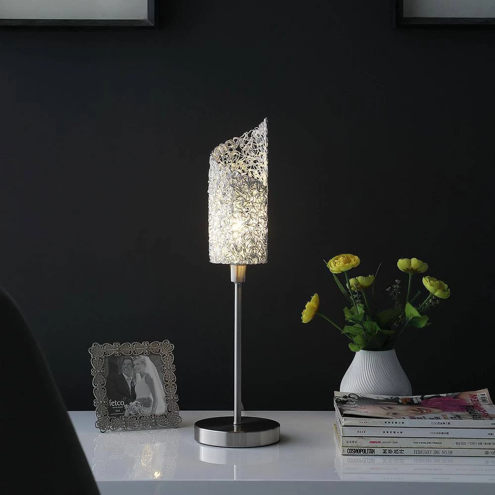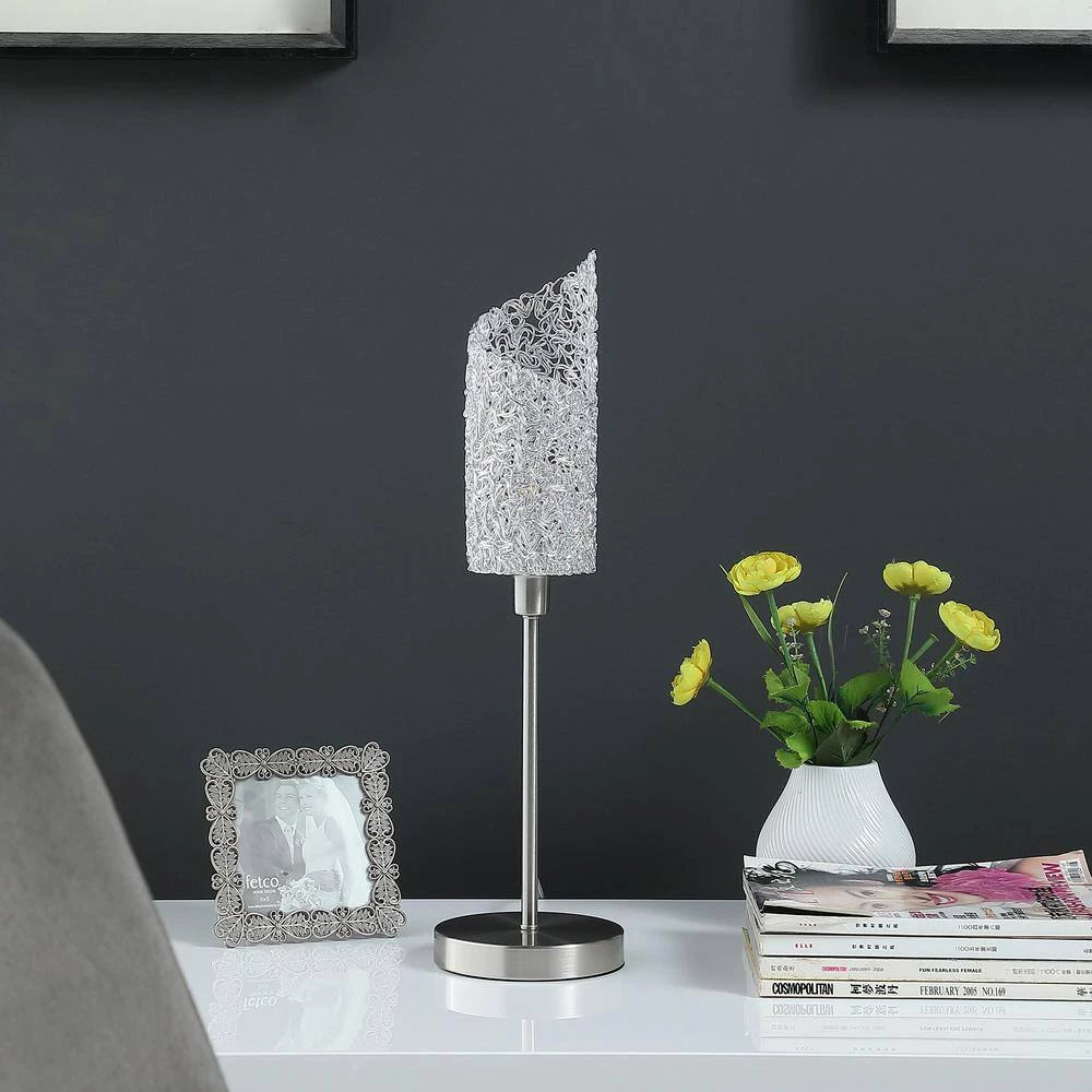 - Materials: brushed silver metal and silver chaotic pattern cylindrical shade