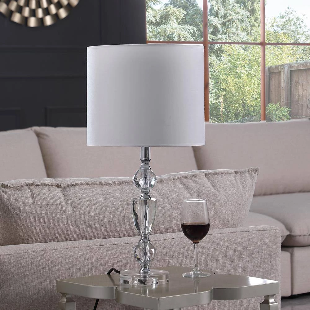 Inspired by the craftsmanship of yesteryear, The white shade and clear spectrum urn and round crystal body of this modern accent lamp creates a stunning and clean appeal. This elegant transitional table lamp sports a stunning urn column crystal and a cut-crystal clear base for timeless accenting. Modern and glamorous style mixed into 1, this Cale cut-crystal column table lamp is topped with a sleek white uno-fitter drum shade. A glistening, carved urn and round column sparkles in this fabulous 100% crystal accent lamp. A single-tiered cut-crystal round base sits below and beautiful, you be able to purchase a self adhesive round rubber to place on the bottom base to prevent from scratching your table top. Add some glam to your decor with this wonderful accent light. this modern interpretation of a crystal table lamp on an urn shape style sits on a round cut crystal pedestal. The design features and bounces light all around the room from its many facets and providing a well rounded element to the design. Place this lovely design anywhere in your home that needs illumination and modern elegance.