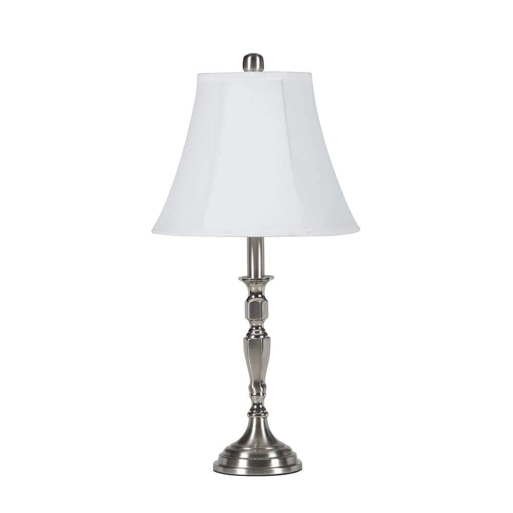 A beautiful satin nickel silver finish has been applied in this charming candlestick table lamp design. The Serge Satin Nickel Candlestick table lamp is decorated with the traditional style of this charming table lamp design. The traditional style base has solid sturdy construction with a scatchless finish. An all white Cotton/Linen blend empire fabric shade offers a contrast up top, and the shade is topped by a satin nickel finial. A highly recommendable must have item for your living spaces.