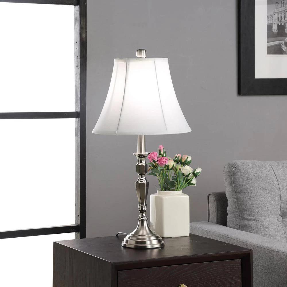 - Material: brushed silver nickel table base, cotton/linen empire shade