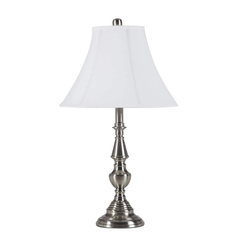 The Seymour Brushed Nickel finish of this table lamp design is complemented by the all-white shade on top. With a traditional candlestick base, it is only fitting that this table lamp would be as romantic as candlelight. This transitional table lamp will bring an elegant feel to any room in your home. A brushed silver nickel finish adds warmth to the detailed base. A clean all-white empire shade complements the brushed nickel finish of the metal-constructed base.