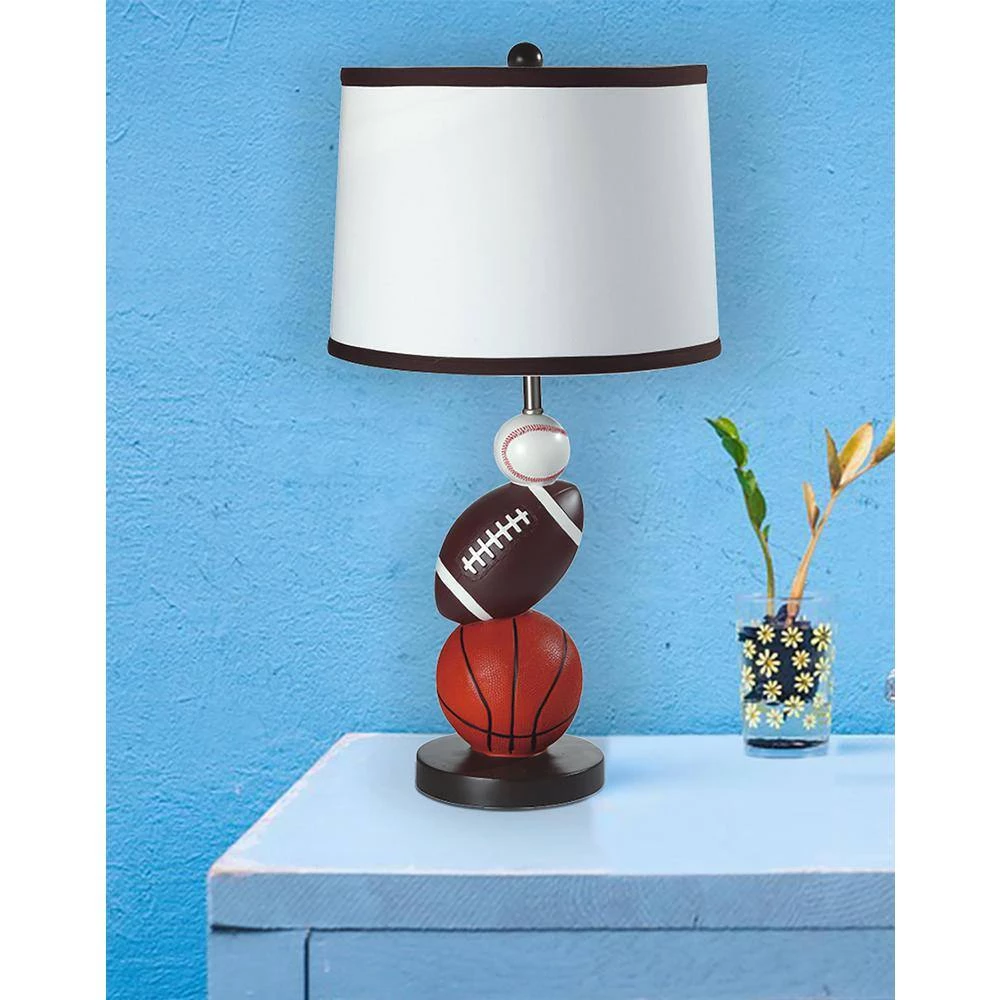 This Multi-Sport Table Lamp features a basketball, football and baseball, topped with a hardback shade. The perfect addition to any sport fan’s room. The lamp has a black rim around the shade and the base is made of resin.