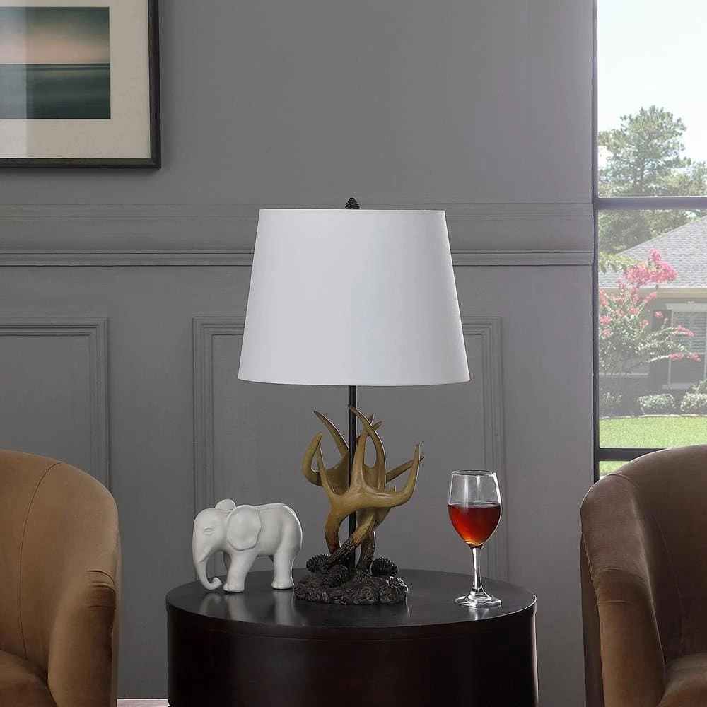 Turn on the drama with a wildlife frontier theme in this antler table lamp. This rustic table lamps are molded to resemble deer antler horns set on top of boulder of rocks and 2 pine cones as the base. Your casual living space turns into a deer adventure when this antler table lamp becomes a focal point. Sheer exotic expression reflects from an eye-catching antler figurine entwined its body and a crisp semi-drum white cotton/linen fabric shade that offers a perfect complement. Bring home a countryside spirit with his wonderful pair of Deer Antler Table Lamps that features an eye-catching design to make a statement and provide a gleaming illumination in the room. The fascinating -toned deer antlers are intricately intertwined to add a rustic charm to the piece and are topped with a pine cone finial for visual intrigue. Perfect for a lodge cabin or old-fashioned Western style setting. Flaunt this creative lamp in your living room as a decorative accent to add character to your space and let the soft add warmth to the room.