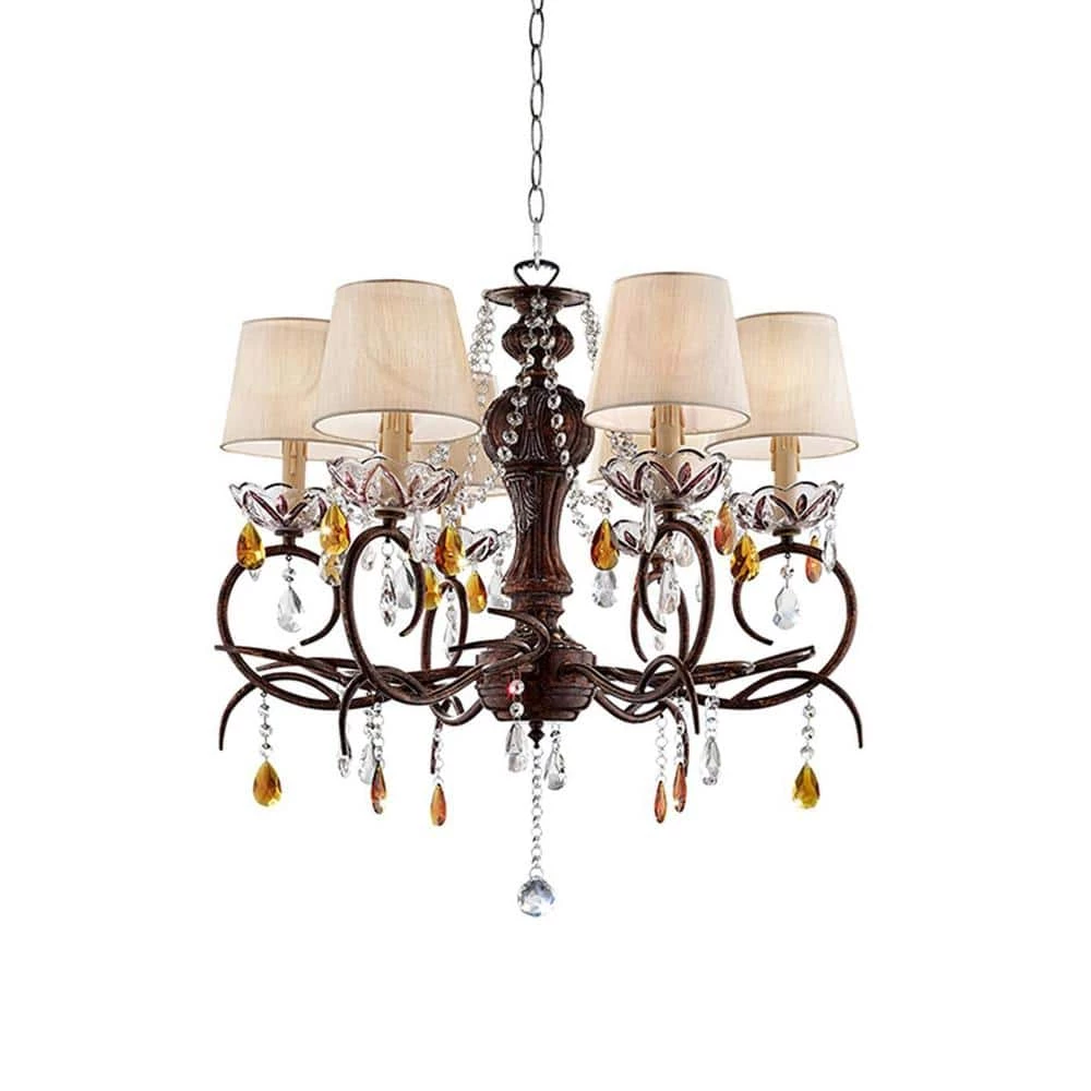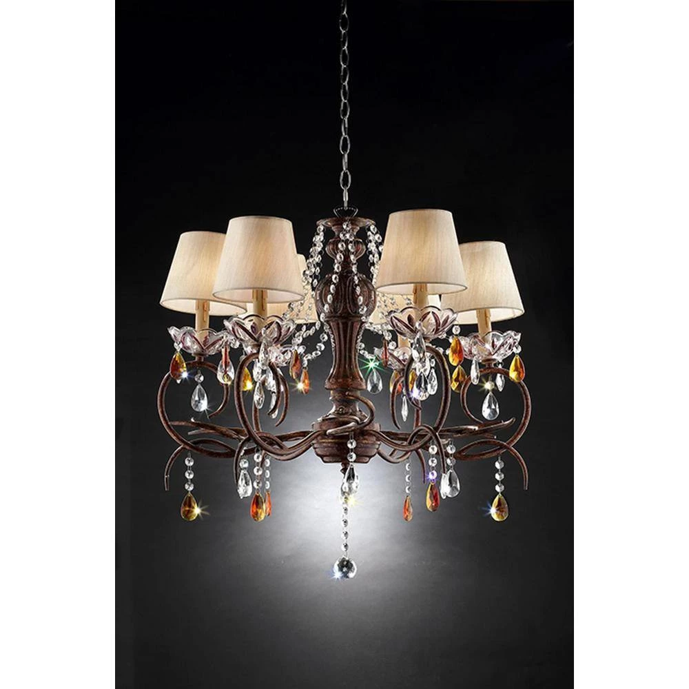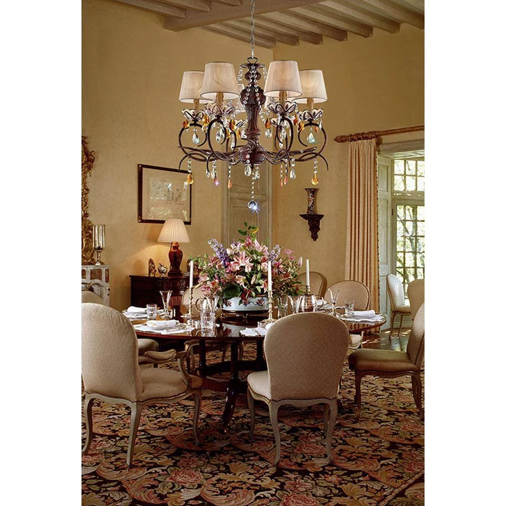 Update your home with the sophisticated elegance of this 6-light reddish bronze chandelier. The Magnolia Crystal Ceiling lamp has artistic curves that glisten from clear and amber crystal accents and pendulous. This Crystal Bronze Chandelier Ceiling Lamp comes with a scroll detailed frame, amber and clear crystal accents and a natural bell shades. This chandelier simply bursts with excitement and glamour. Victorian Core column is accented by a tree branch motif with crystal droplets. Candelabra Lights rest on crystal saucers with crystal bead ending with a tear drop pendants. Display with shade or remove it to create a stunning candelabra-like accessory.