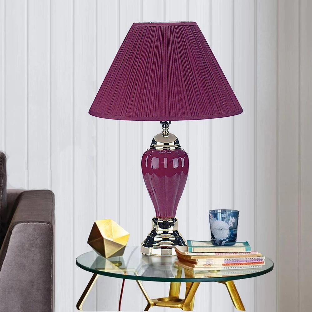 Place this in any room to give the room a classic style. This lamp blends in perfectly with different rooms especially to vintage, contemporary, modern, and/or basic. Let this classic modern burgundy ceramic lamp bring the brightness in you. Bold color with gold accents adds a decorative element to any room. Made of Burgundy ceramic pumpkin finish w/ gold metal trim and topped with an empire uno color match linen shade.