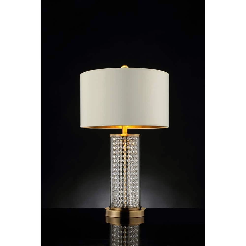 Elegant yet understated, this Crystal Pluviam table lamp is sure to please. The perfect addition to modern decor, this crystal table lamp features a cylindrical glass drum w, stacked imported crystal beading strands cascading like waterfall to a crisp off white linen shade w, matte gold lining for a dramatic effect and creates a stunning and clean appeal. Sleek and stylish, this crystal column table lamp is a living room or bedroom essential. Matte gold finish steel accents elegantly play up its chic, crystals and glass body, giving it a truly sophisticated look. Ideal for an end table, its off-white drum shade w, matte gold lining creates the perfect amount of light for leisurely evenings at home. Add some glam to your decor with this wonderful accent light. Update any space instantly by adding this glam crystal glass table lamp.