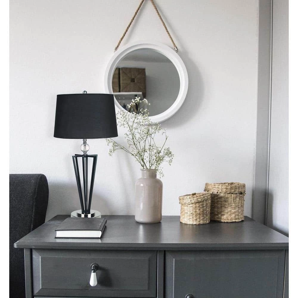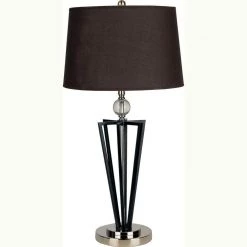 This contemporary mid-century Table Lamp will set the tone for your decor. A chic modern table lamp set in a warm matte black metal finish sitting on a chrome metal base with black powdered drum shade on top. The same finish in the base of this contemporary design extends to the finial and rotatry switch for streamlined look. Inspired by the simplicity and utility, This Mid-century table lamp features a crystal ball accent between the bulb socket to the matte black table body and chrome base that supports together in place by tension. The effect is that of a floating form over a visible metal base w/ a color coordinated black cord compliments the table lamp. The Mid-Century Table Lamp encourages mixing size and shapes for an interesting display.