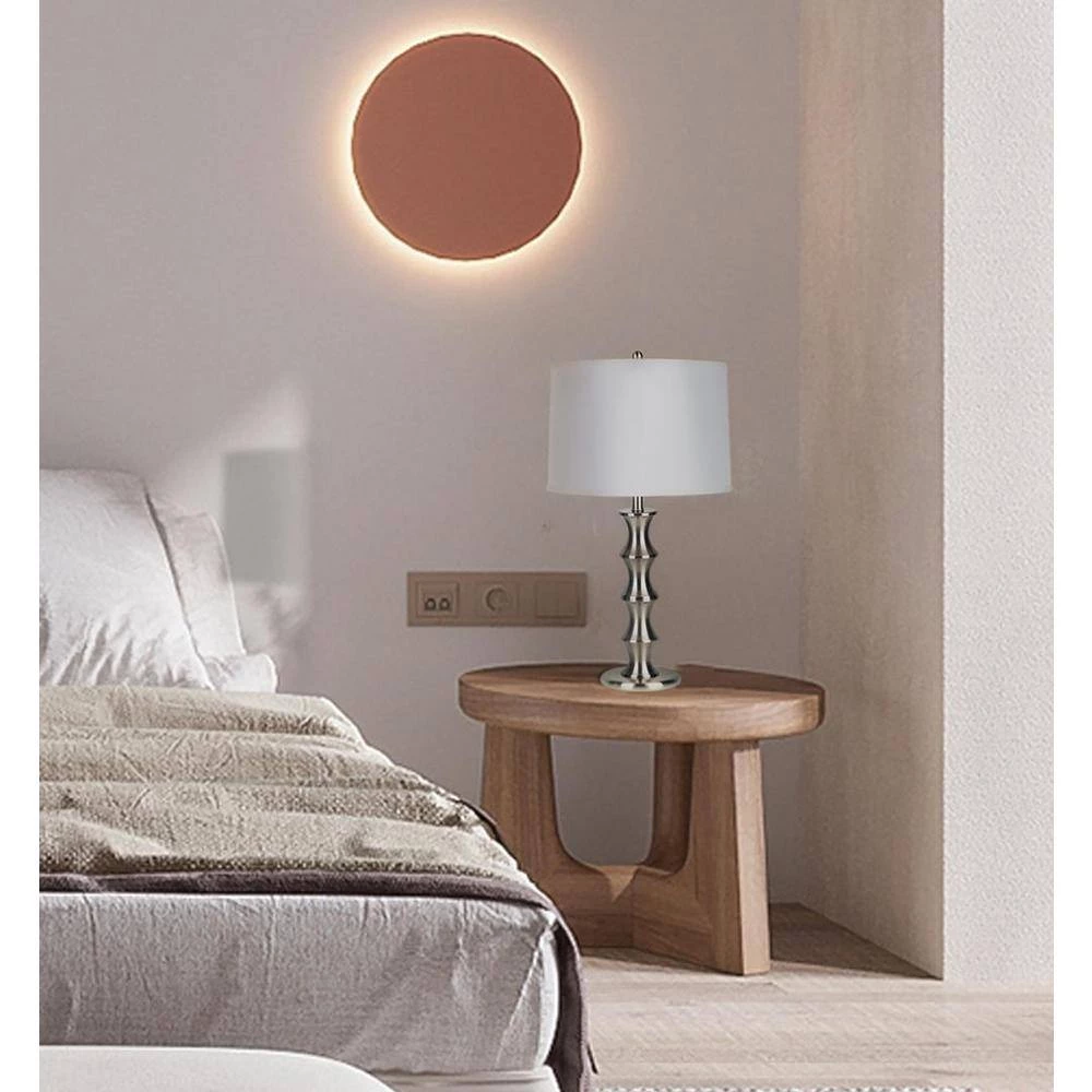 This is a smart, transitional table lamp and is the perfect way to update or balance a room decor. The satin nickel steel finish is topped by a hardback cream linen shade. The 3-way sockets offer easy control over the light output.