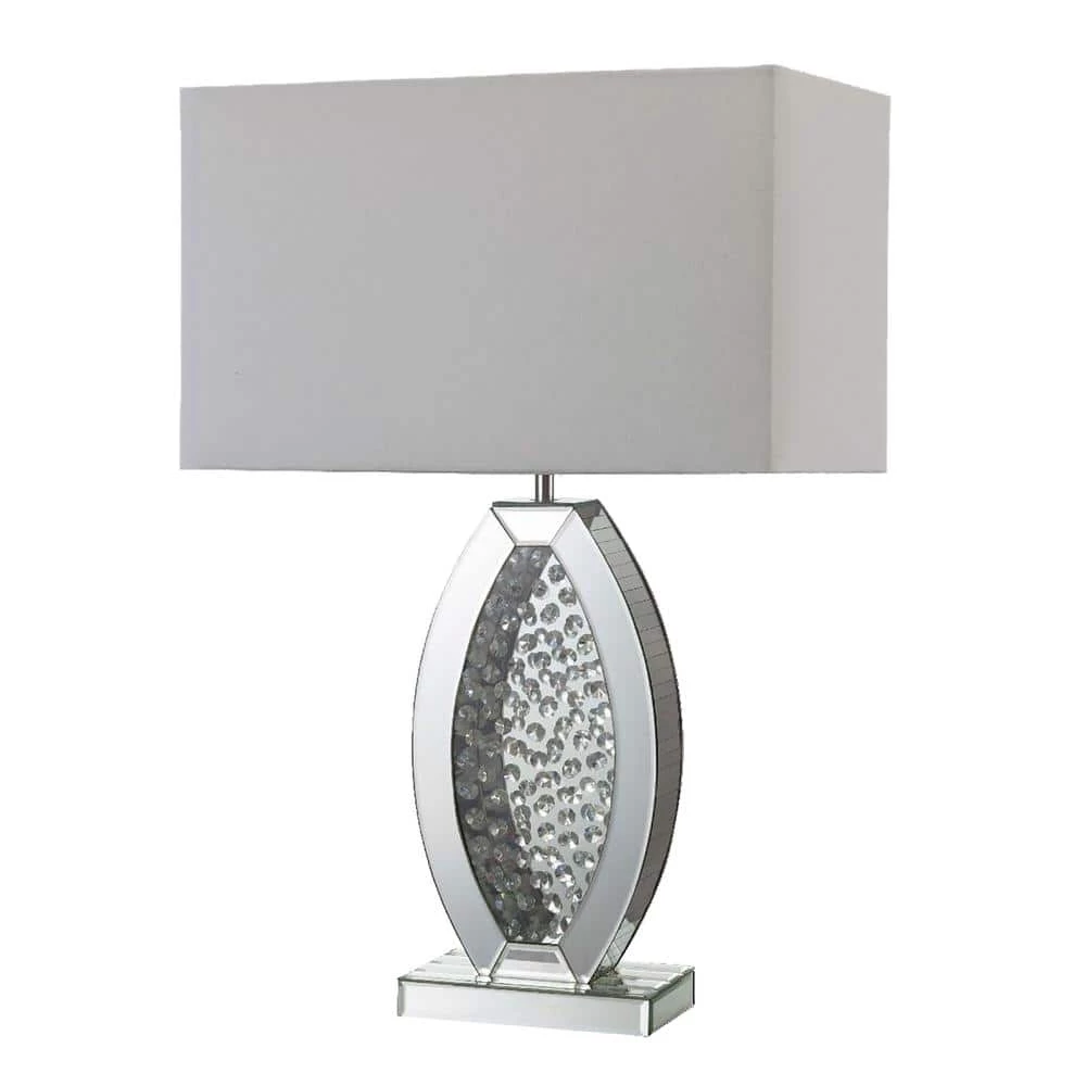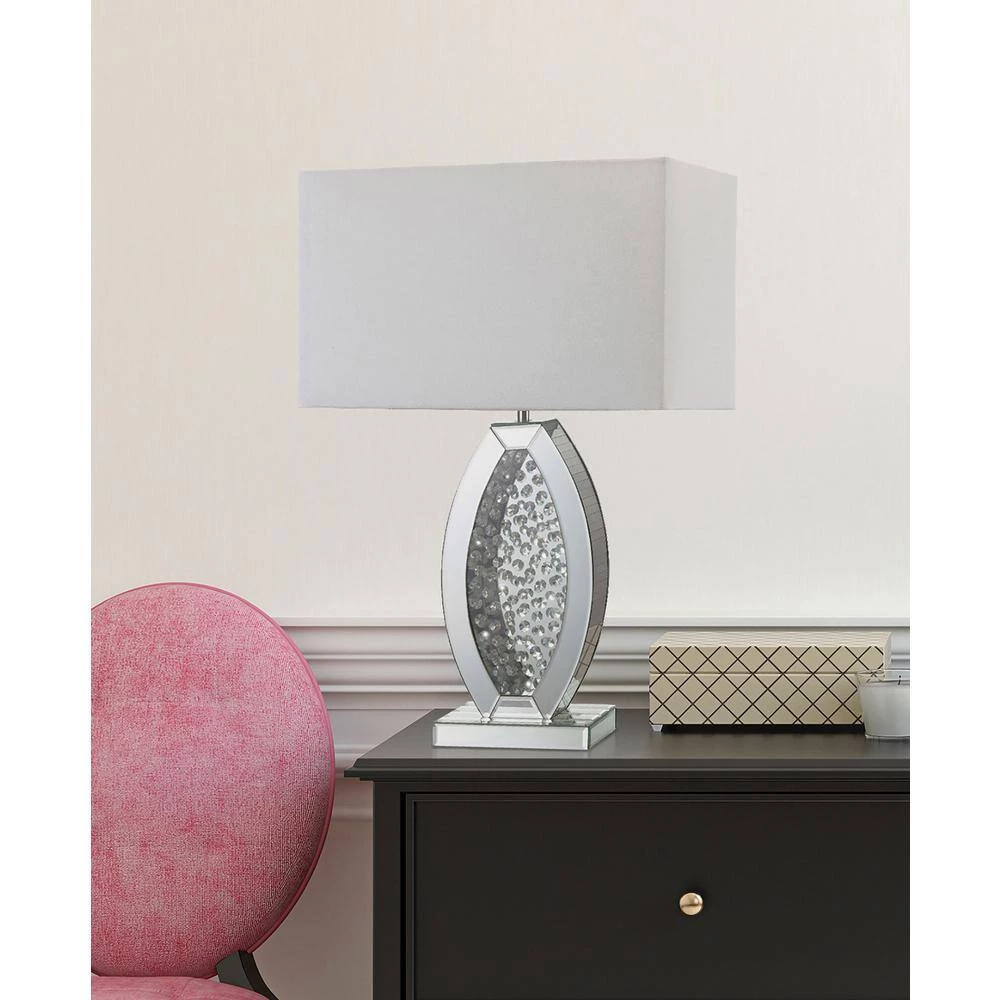 This beautiful and glamorous Neville Crystal Ice mirrored table lamp is the perfect addition to any home. Featuring a crystal-embedded floating inside the beveled mirror trim accents, this lamp makes a bold statement. Its reflective mirrored quality and unique design lend to its one-of-a-kind aesthetic and works perfectly in a glam styled bedroom or living area. A shimmering glow creates a beautiful picture in a dark room or area. The sparkling crystals will dance and gleam under the light of the table lamp. Your family, guests, and you will be in for a magnificent crystal light show with this crystal mirrored table lamp. This lamp will elevate into a beautiful visual centerpiece for any end table or console stand.