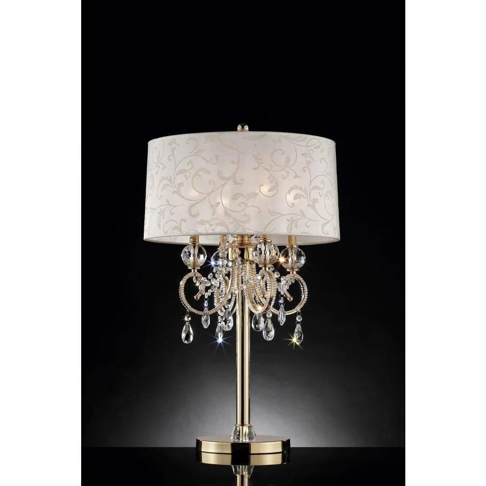 The Aurora Crystal Chandelier table lamp combine beauty with function. This design features an inner chandelier style light with crystal elements and a barocco drum shade. A charming accent for your living space, chandelier crystal table lamp combine the best of 2 worlds. Up top is a chandelier style form with gorgeous faceted glass crystals. The crystals appear to be dripping from beneath the barocco shade. Display with shade or remove it to create a stunning candelabra-like accessory. The solid column base is coated in a yellow gold finish, offering an elegant, old-world feel to the design.