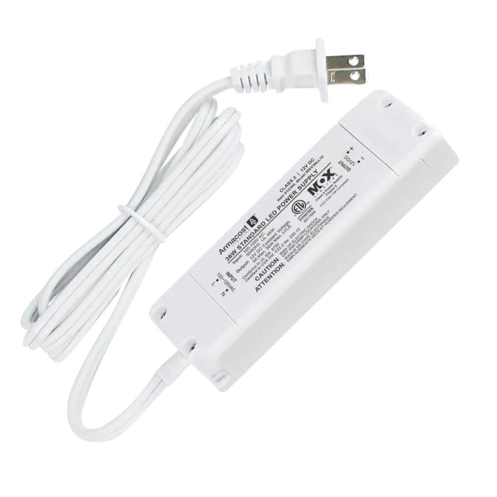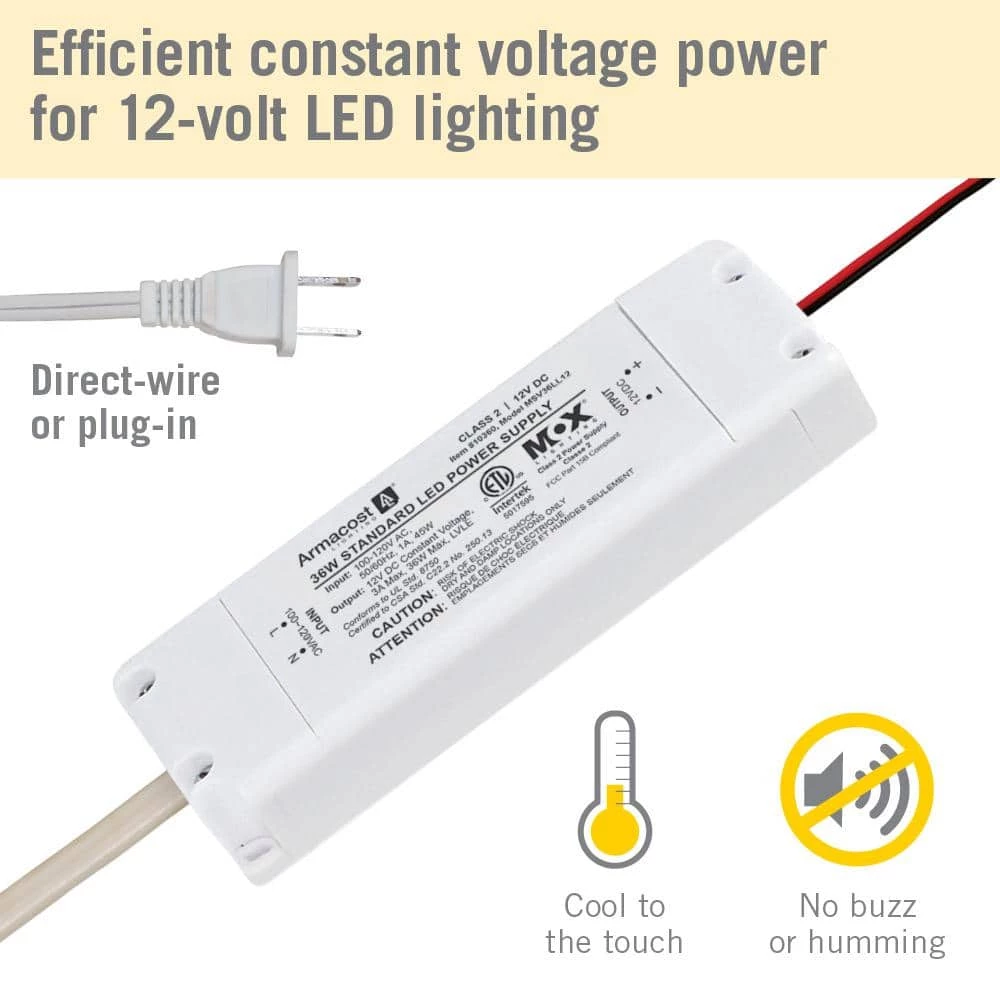 The Armacost Lighting’s 36-Watt 12-Volt Standard LED Power Supply delivers stable and energy-efficient, low-voltage power to any LED lighting installation. The LED driver is designed using high-performance, professional grade electronics that provide stable and efficient low-voltage power. The power supply is rated up to 36-Watt at 12-Volt. No minimum load required. Plug-in or hardwire with detachable AC power cord. Not compatible with 120-Volt AC dimmers. for best results use LED Lighting LED products. Includes: 1) 36-Watt, 12-Volt LED Driver, 1) Detachable AC Power Cord.