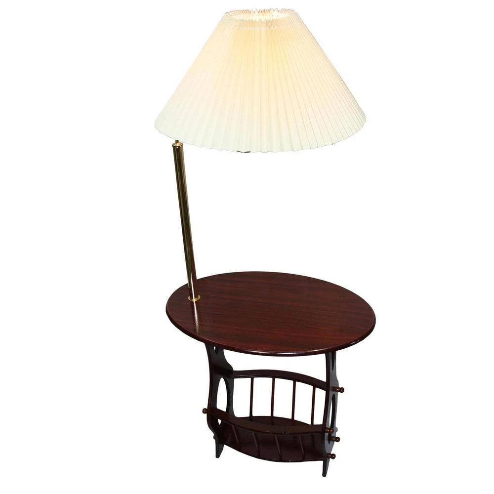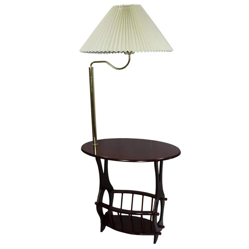 This space-saving end table is a floor lamp, accent table and magazine rack all-in-1. Perfect for placement next to your reading chair. Arm floor lamp takes a 3-way 100-Watt bulb, CFL Bulb Compatible. Includes an ivory hard paper pleated lampshade (19.25 in. Dia at the bottom x 11 in. H) on a 7.25 in. H Harp. Traditional style lamp table with cherry finish, built-in magazine rack beneath the tabletop. Table Dimensions: 23.5 in. L x 15.25 in. W (tabletop) x 22 in. H, Actual product weighs 9 lbs. 120-Volt, 5 ft. power cord, UL approved. Assembly required. Space saver side table with attached arm floor lamp and integrated magazine rack. This table is best to gift on anniversaries or housewarming parties and suitable to most of the home decor theme. This table can be used to place in your living room beside your sofa or recliner for keeping your magazines, TV remote and even the lamp shade can be used while reading your favorite book. This table has a traditional style and blends well with most of the home decor themes. The table has an elegant cherry finish that can suit any room. The table top has an oval shape that provides ample space to keep your necessary items. This traditional table comes with the lamp and has a trestle based that gives support and stability to the table. So, bring home this functional lamp end table and make it the center of attention in your room.