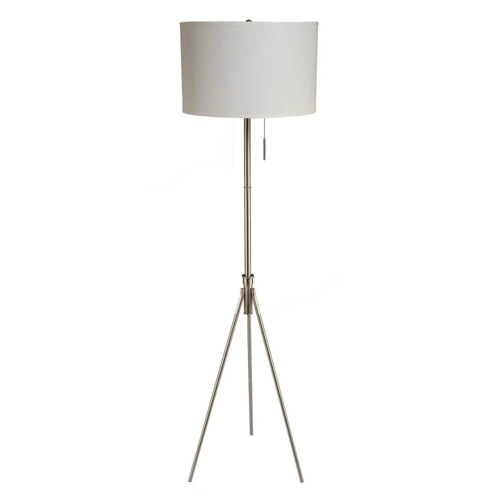 - Drum shade on a brushed silver tripod legs, base measures 4.5 in. W x 35.5 in. H