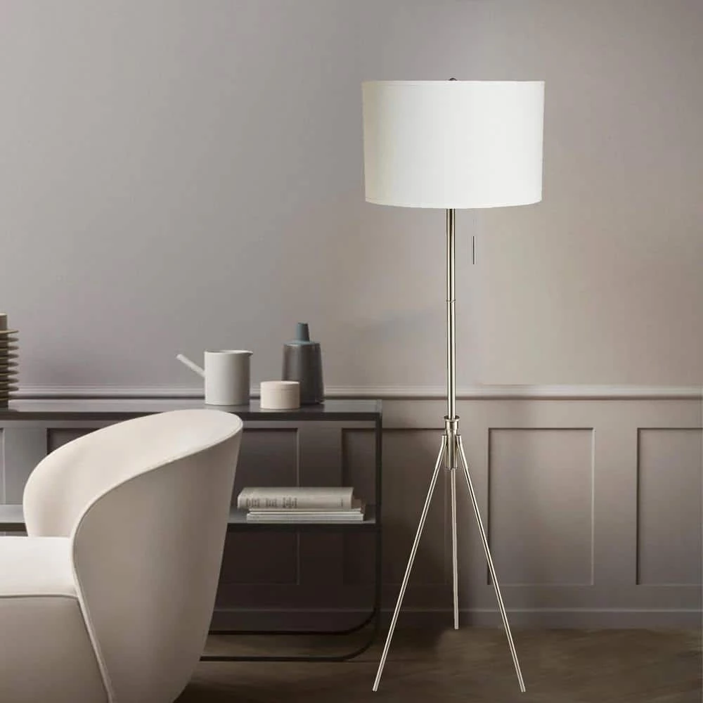 The Mid-Century Height Adjustable Tripod Floor Lamp creates the perfect set for the urban design that is your style. A trio of sturdy silver metal legs creates the base for this floor lamp. The score of your lamp is accented by a drum – the white cotton/linen drum shade, that is. This lamp would be great in a living room space, bedroom space, as well as any room in your home or office that would look finished with a modern lighting accent. Includes an easy access single pull chain switch for easy on/off and uses a 100-Watt Type A bulb, CFL and LED Light compatible. Try contemporary on for size with this floor lamp’s ultra-cool tripod design. Brushed silvertone stand is a striking complement.