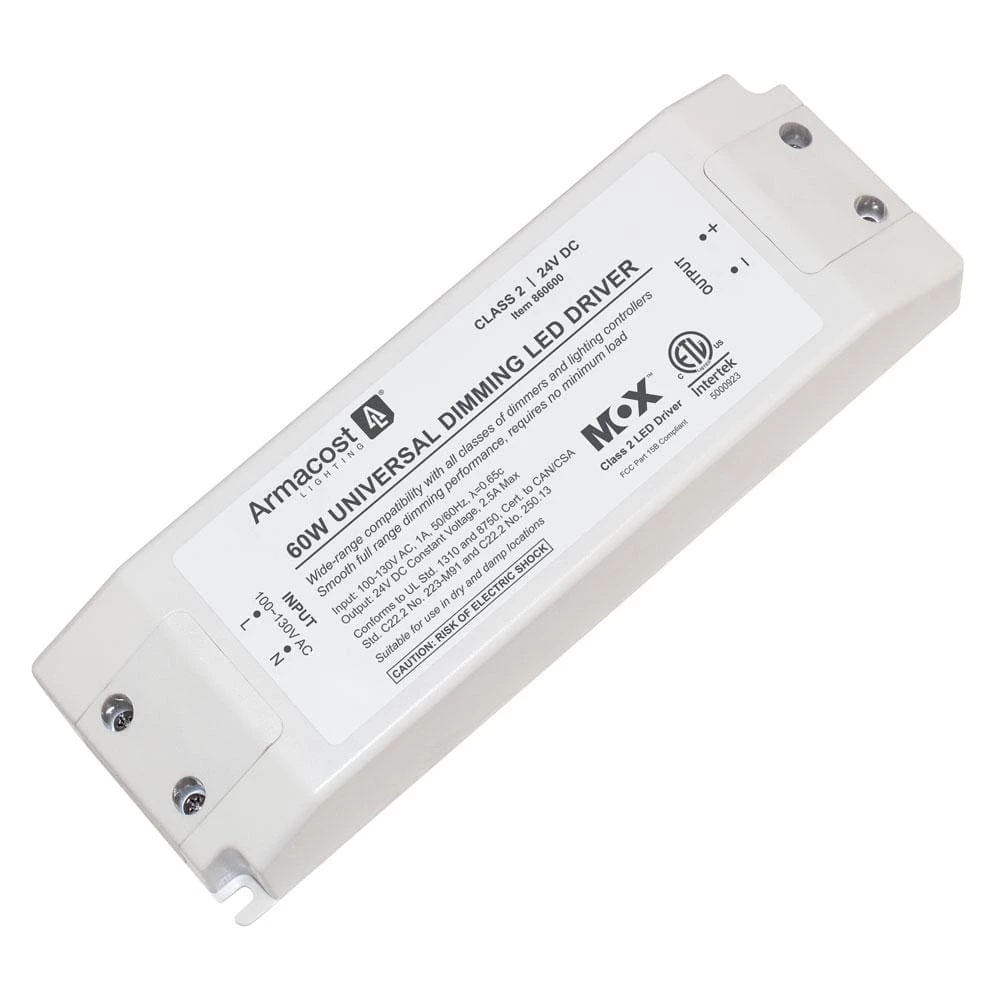 The Armacost Lighting 60-Watt; 24-Volt Universal Dimming LED Power Supply delivers stable and energy-efficient, low-voltage power to any LED lighting installation. The LED driver is designed using high-performance, professional grade electronics that provide stable 0% or 100% dimming free of any pop-on or drop-off. The power supply is rated up to 60-Watt at 24-Volt. For the best results use Armacost Lighting LED lights, switches and dimming light controls. Plug-in or hardwire with detachable AC power cord. Suitable for both dry and damp locations. Includes: one 60-Watt, 24-Volt Power Supply, 1 Detachable AC Power Cord.