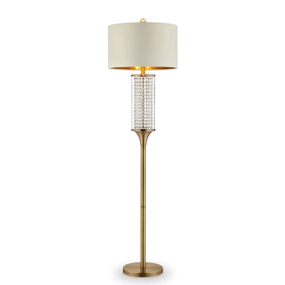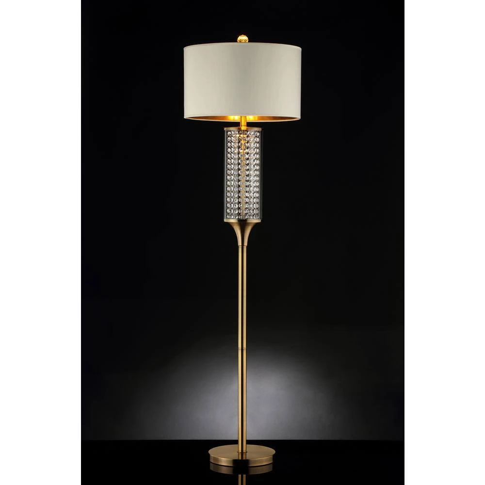 Elegant yet understated, this Crystal Pluviam floor lamp is sure to please. The perfect addition to modern decor, this crystal floor lamp features a cylindrical glass drum w, stacked imported crystal beading strands cascading like waterfall to a crisp off white linen shade w, matte gold lining for a dramatic effect and creates a stunning and clean appeal. Sleek and stylish, this crystal column drum floor lamp is a living room or bedroom essential. Matte gold finish steel accents elegantly play up its chic, crystals and glass body, giving it a truly sophisticated look. Ideal for beside a reading chair or bedside, its off white drum shade w, matte gold lining creates the perfect amount of light for leisurely evenings at home. Add some glam to your decor with this wonderful accent light. Update any space instantly by adding this glam crystal glass floor lamp.