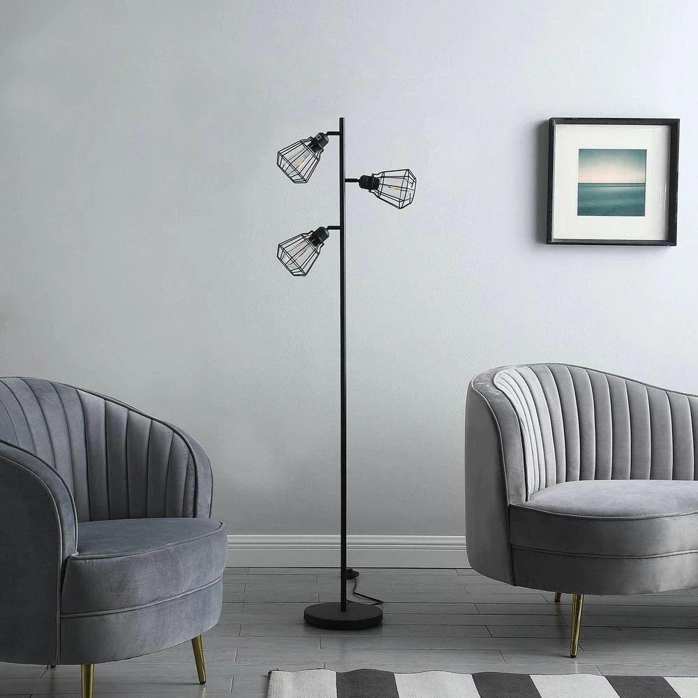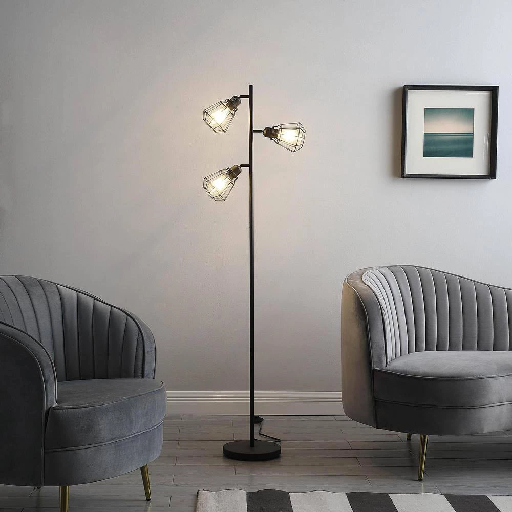 Illuminate a home office or living space, sleek and minimalistic, this matte black 3-light industrial floor lamp features vintage shape Cage shades and a step-on On/Off switch along the black cord. Light your home in style with this 3-light floor lamp finished in matte black and can use 3 Edison bulbs to make the lamp unique as a farmhouse design. 3 vintage cage shades acts as spotlights can be adjusted to focus light where you need it. Create a well-lit place with this versatile 3-light floor lamp, with a slim column pole profile that ascends from a round base in a matching finish. Cast a warm glow in multiple directions that evokes a minimalistic vibe. An understated tree design offers 3-lights, each at a differing height on a slender post body, subtle metal cage shades taper for a touch of elegance and is great for urban, industrial styles of decor.
