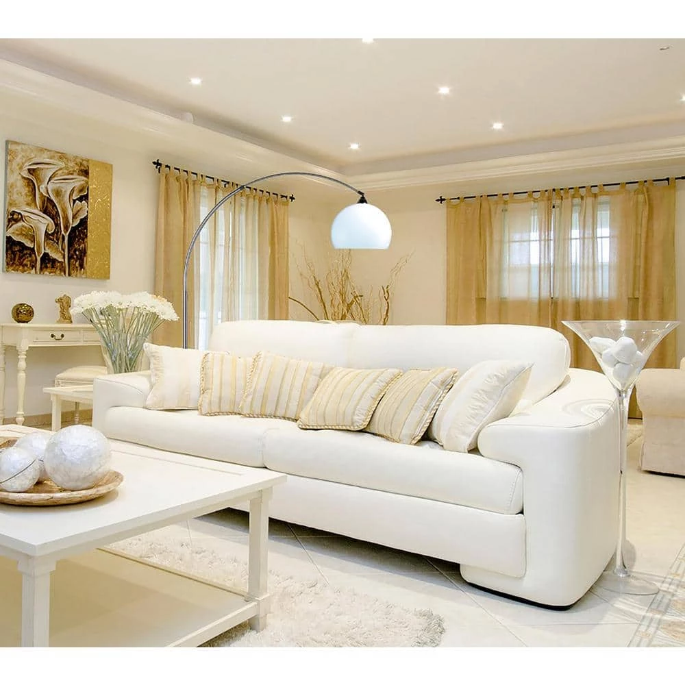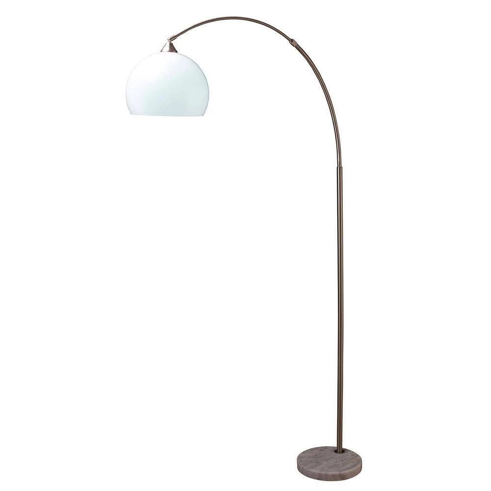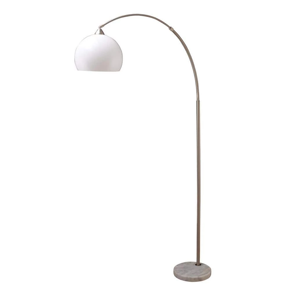 The arc lamp goes over and above modern expectations, suspending a geometric egg shell shade in crisp white acrylic shade blend from a satin nickel-finished arch. Round white/grey marble base adds a classic touch. This modern floor lamp will blend perfectly with your current home decor. The white eggshell uno lamp shade portrays the look of purity and retro feel. The brushed silver finish on the base and stand agree with this flawlessness. An on/off step-on switch offers a very accommodating feature.