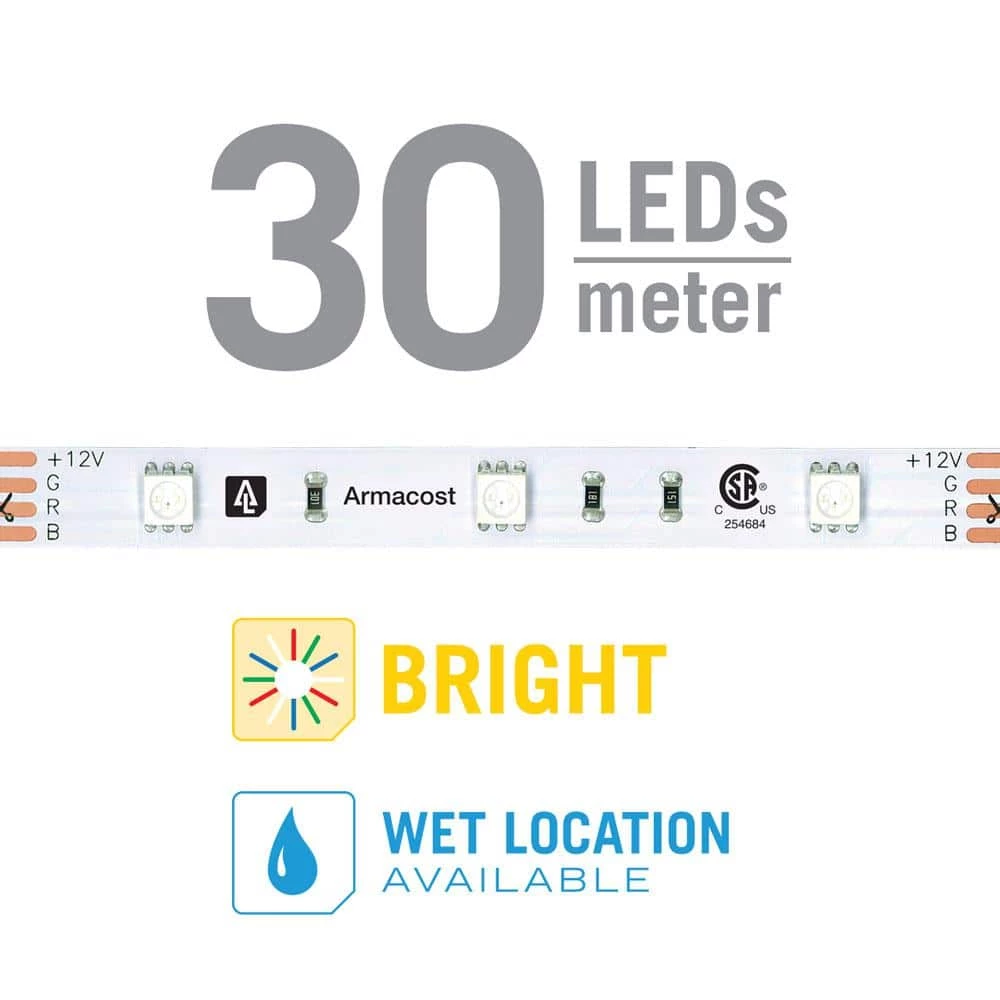 Professional quality RibbonFlex Pro Custom Color RGB LED tape lighting is part of a component-based LED lighting system that lets you design for your unique lighting needs. This wet location model is ideal for residential and commercial indoor or outdoor applications. Fully customizable, cut to size or extend for longer runs connect virtually endless lengths of LED lighting when used with Armacost Lightings RGB signal repeaters. 3M high-bond adhesive tape backing makes installation as easy as peel and stick. Use a color controller to create a near endless array of colors, plus shades of white, for exceptionally versatile creative accent lighting. Add color to tray ceilings, coves, under cabinets, architectural elements and more. Accent deck railings, doorways, porches, docks, gardens or anywhere creative lighting and color is desired. For linking longer lengths, basic wiring and soldering skills are required, comes with detailed instruction guide and links to video tutorials. Requires an RGB LED controller and a 12-Volt DC power supply, each sold separately.