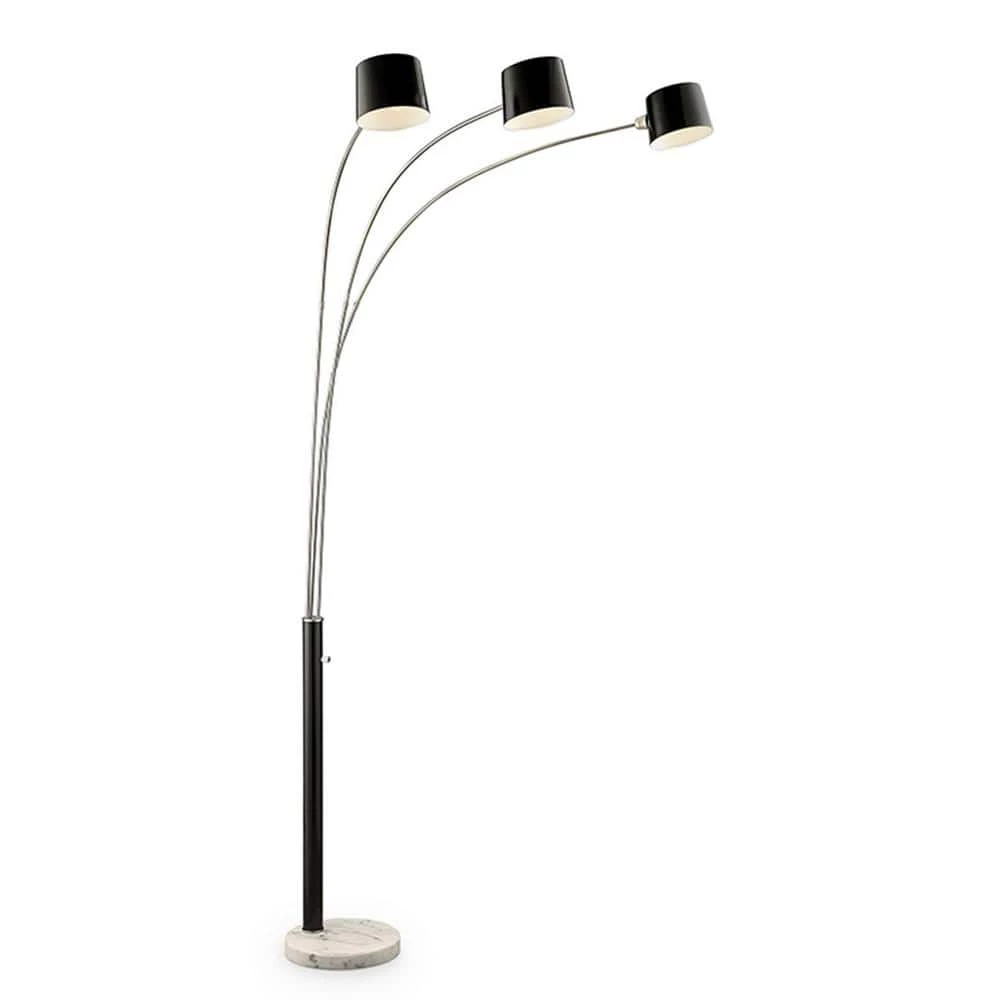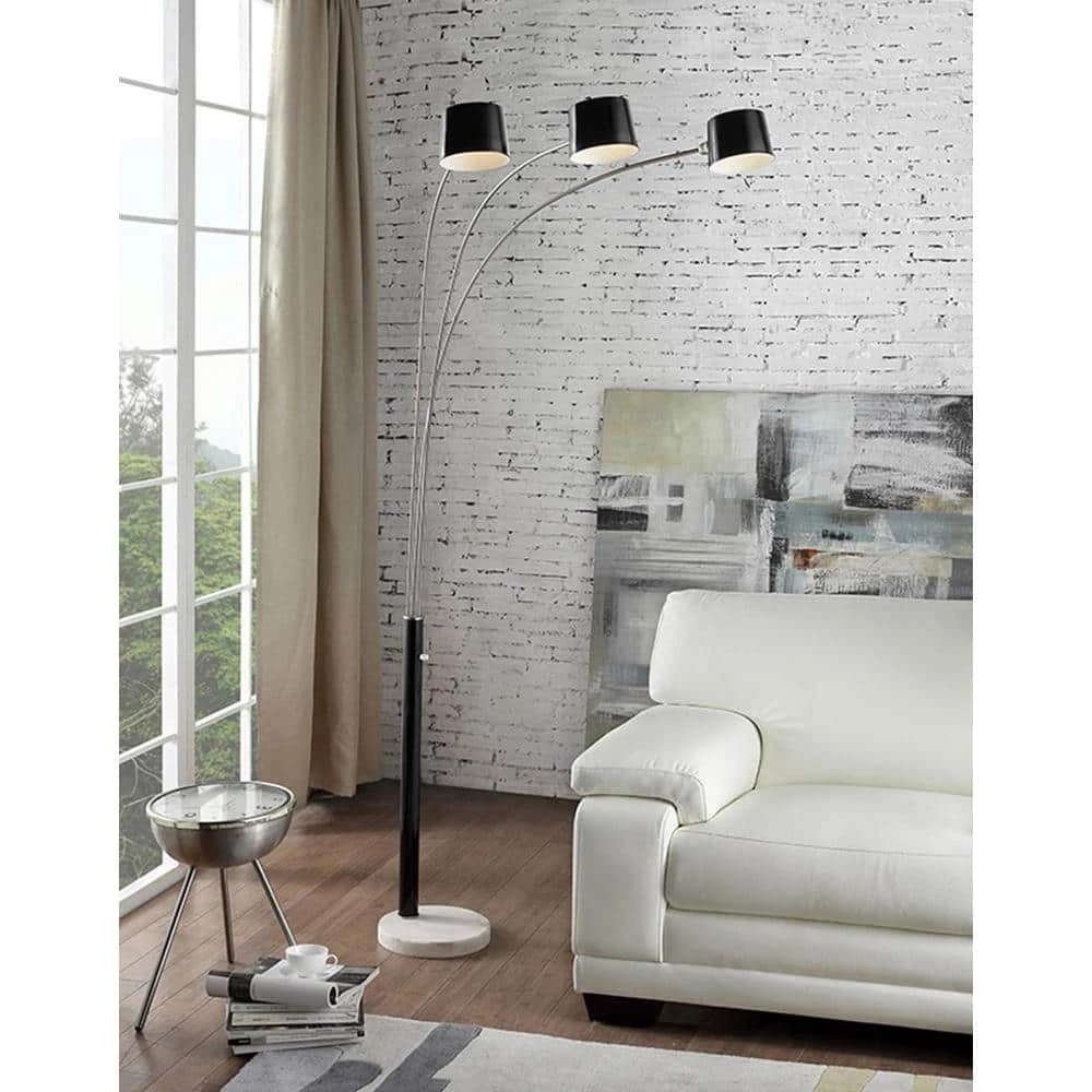 Elevate your decor with this Nova Black arc floor lamp, which comes in a sleek black finish and has a striking modern design. A striking contemporary Nova arc floor lamp with a black finish and metal base. The sleek design features 3 mini round drum with white lining shades that is not adjustable but can be spread out to fit your needs. An ON/OFF foot switch allows ease of use. Please note that this lamp is non-dimmable. A mid-century modern design with plenty of style, the domed shades of this floor lamp have mid-century appeal. A circular marble base anchors the design.