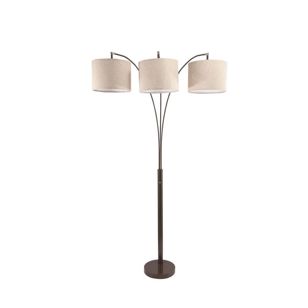 Chic and elegant, this contemporary Novalit 3-light arc floor lamp is a dramatic choice with a warm espresso brown finish. Stabilized with a beautiful espresso metal base, this contemporary 3-light Arc floor lamp features an arc arm the lends a refined sensibility. Capped with off-white textured linen shades, this lamp is a stylish addition over a sofa or in a spacious living area. Boasting a rich espresso finish, this lamp includes 3 adjustable shades that can tilt to a 45° angle for added versatility. You may not be able to adjust the height of the lamp, but you be able to spread it ftom left to right.