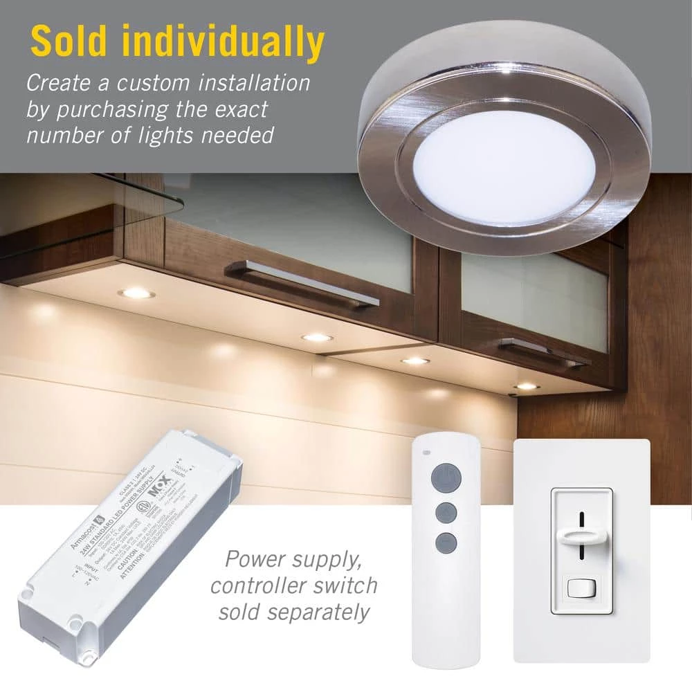 These LED luminaires feature an all-metal housing and can be installed as surface-mounted puck lights or recessed downlights. Perfect for decorative lighting in and under cabinets and display cases or as bright task lighting beneath cabinets. Fully dimmable and compatible with standard 120-Volt AC dimmers and Armacost Lighting’s line of 12-Volt dimmers, wireless and Wi-Fi controls.