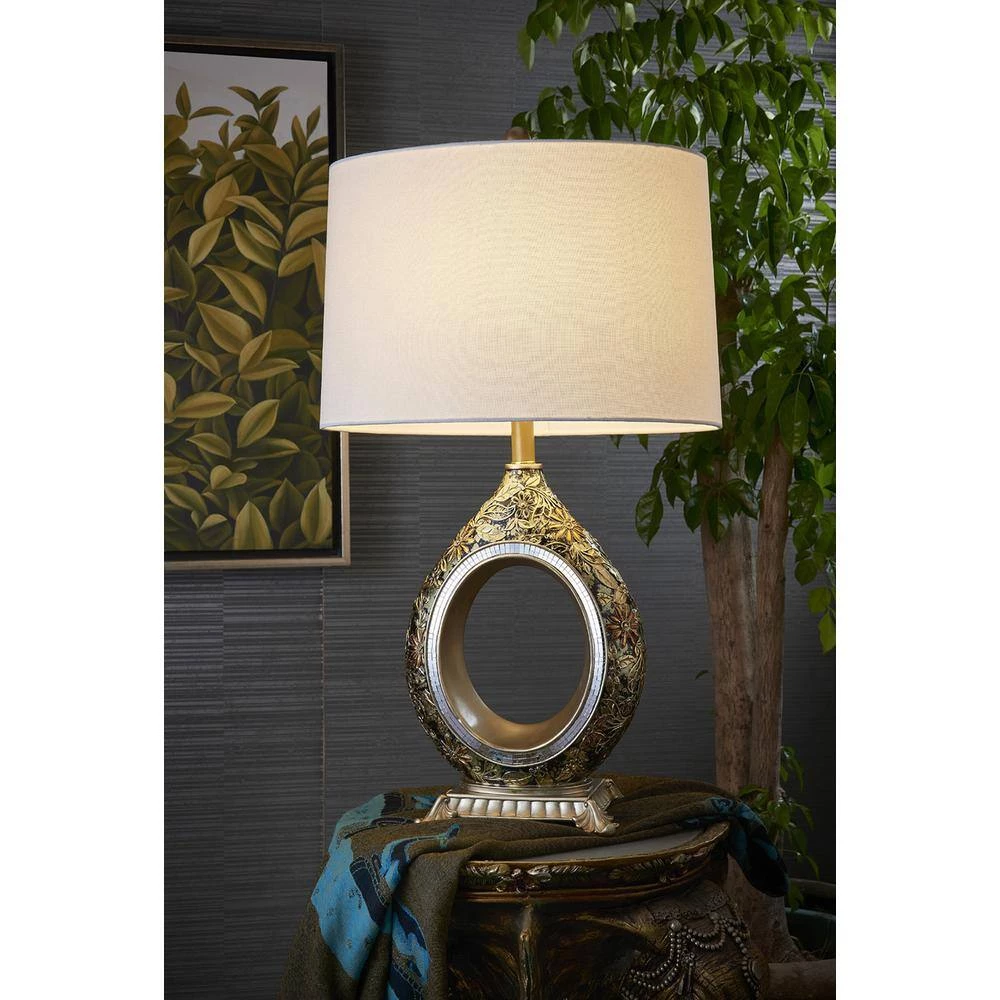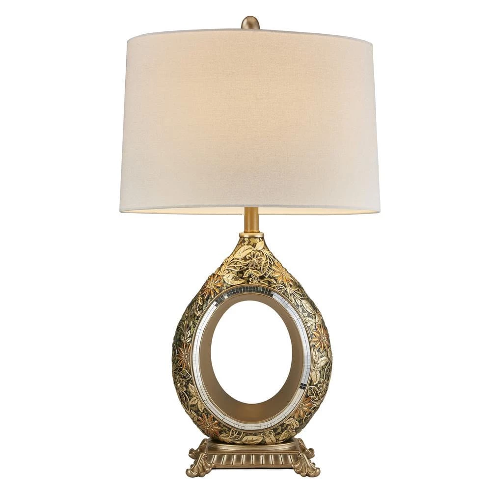 This Chrysanthenum Resin Multi-Colored Table Lamp has a transitional flair that adds a touch of elegance to an otherwise sedate room. Teardrop shape Multi-Colored Floral Pattern are inlaid all over the teardrop Table base to create this Table Lamp. The trim has a mirrored glass accented on the inner rim plaque of the Table Lamp for extra glam a distinctive look. Its robust teardrop silhouette body sitting on matte silver pedestal base with 4 filigree footed legs makes it just the right fit for an entryway console. This Table Lamp blend modern and transitional style with an estate artistry details. This charming polyresin table lamp is the result of an Estate-Inspired look adds instant glam to any concole, desk or bedside table.
