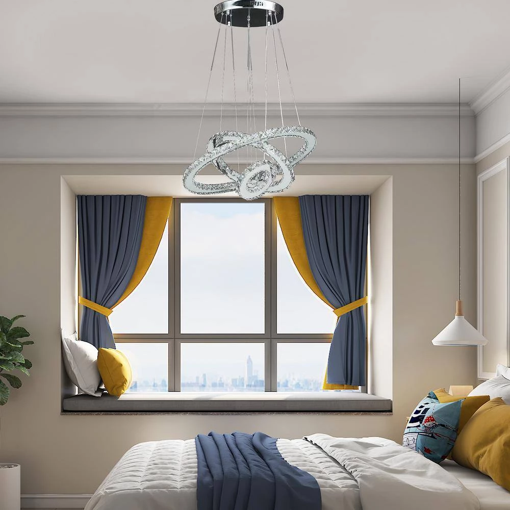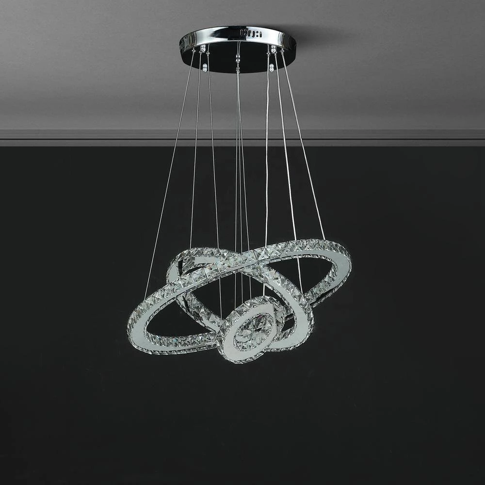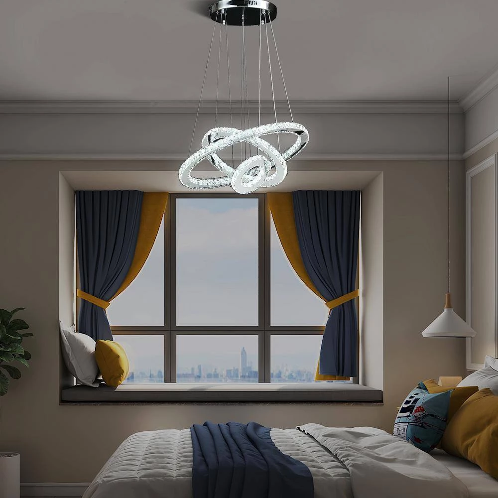 A unique silver chrome aluminum, triple hoop, clear crystal ceiling light, inspired by the pattern of quickly formed ice crystals. The Eira Ice Crystalcomes with over 9000 faceted crystals from this chandelier. Suspended from delicate, height adjustable, clear wire cables; position this feature light over dining tables, in bedrooms or as a centerpiece in your living room for an amazing compliment to your home interior. The modern pendant light fixture is decorated with top-quality K9 crystal is a variety of optical borosilicate crown glass. This 3-light unique chandelier fuses playful glam whimsy with a modern, sleek design to elevate your living or dining room. The body features 3 tiers of elegant ring lights with built-in LEDs – arrange them in a V-shape or at different angles. Plus, this refined chandelier is both sloped-ceiling adaptable and dimmer-switch compatible. The unique design makes this chandelier a perfect piece to light up your entryway, dining room, sitting room, kitchen, or even your bathroom with this LED chandelier. The modern flush mount pendant ceiling light is featured with high clarity generous rings of cascading 100% crystals to catch the light. The round ring design hangs from almost invisible wires with brilliant integrated LED shining unseen from within. Comes with a white battery operated remote control that adopts dimmable brightness and 3 color temperatures to suit your mood (3000k warm white, 4000k neutral white, 6000k cool white).