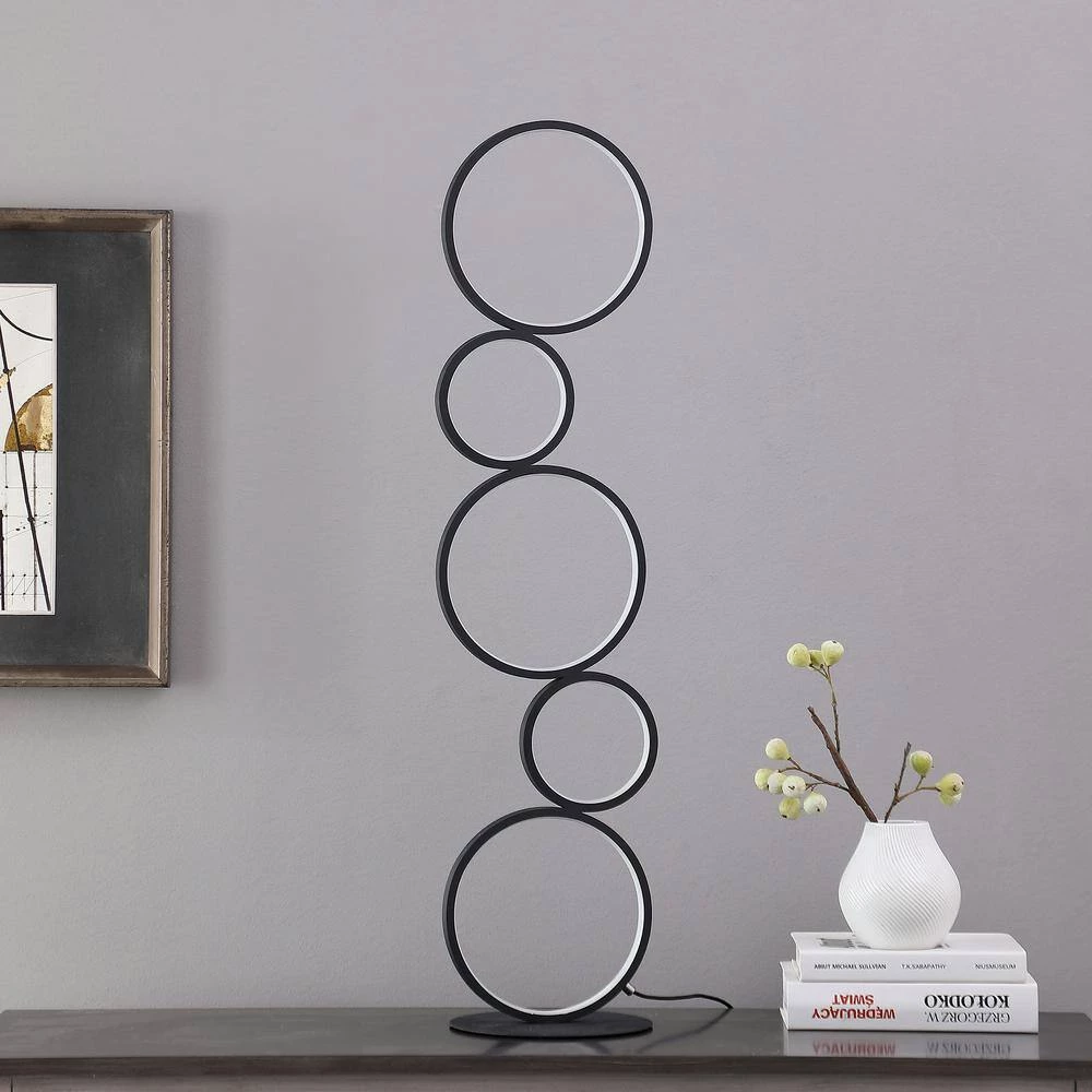 5 Ring Shaped Else LED Large Matte Black Table Light create Minimalist 5-Light Night Lamp for living room, office, hallway, nightstand, or bedside in your bedroom. Highly futuristic and highly energy efficient, The LED Table lamp is the definition of where contemporary style intersects with modern technology to create a truly revolutionary light that’ll continually captivate the attention and imaginations of you and your guests. This multi-functional lamp gives a simple and elegant visual impression, which can be used for different types of lighting needs and as a special assortment. Well made to ensure quality lightning for many years. An integrated LED bulb lines the inside the frame and emits a bright clean light throughout your space. The on/off dimmer step/on switch is located on the cord so you never have to fumble around in the dark. Dimmer function: Press or Step on to turn on the lamp. Press and Hold for lamp to lit from bright to brightest. Press or Step on to turn off the lamp. Exceptional bright white light perfect for reviewing documents or architectural designs.