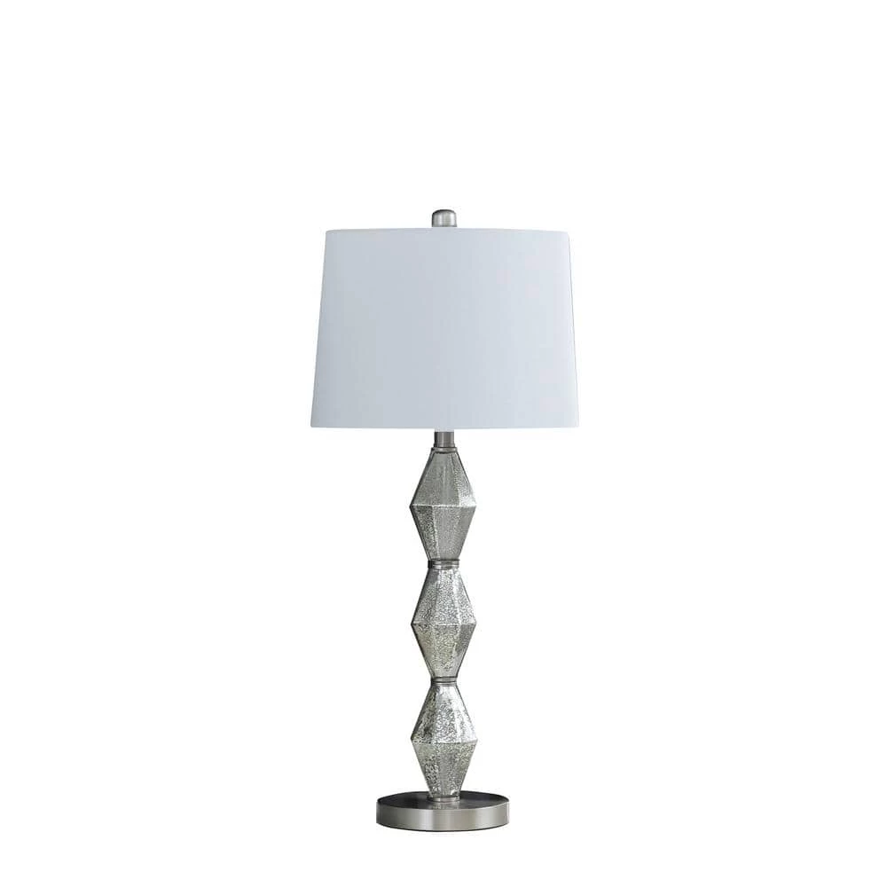 With its brushed silver base, silver textured geometric glass stacked frame and white cotton/linen shade, the Emil Moderne table lamp upgrades transitional decor in any space, the silver and textured geometric glass of the Emil Moderne table lamp make it a versatile fixture perfect for transitional decor, a round brushed silver base supports a frame of steel and glass; the silver textured glass portion is a bold geometric shape and the steel portions feature a gleaming brushed silver finish Displaying mixed materials and neutral colors, the Emil Moderne table lamp upgrades transitional decor in a bedroom, office or living room, the white semi drum shade has an attractive texture and the glass portion of the frame features a faceted design that highlights various shades of silver, a white clean cotton shade completes the look, making this transitional table lamp ideal for a nightstand or desk.