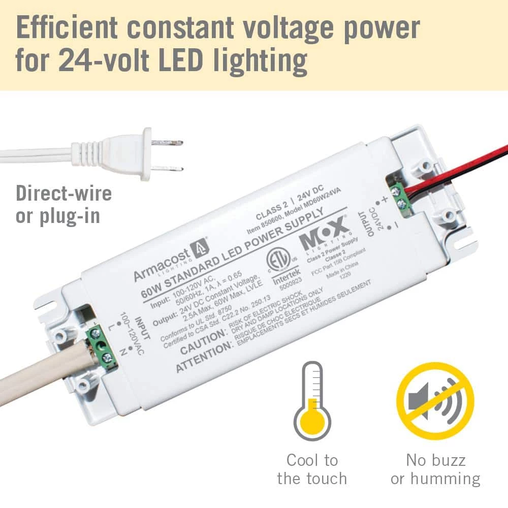 The Armacost Lighting’s 60-Watt. 24-Volt Standard LED Power Supply delivers stable and energy-efficient, low-voltage power to any LED lighting installation. The constant voltage LED driver is designed using high-performance, professional grade electronics that provide stable and efficient low-voltage power. The power supply is rated up to 60-Watt at 24-Volt. No minimum load required. Plug-in or hardwire with detachable AC power cord. Not compatible with 120-Volt AC dimmers. for best results use Armacost Lighting LED products. Includes: one 60-Watt, 24-Volt LED Driver, 1 Detachable AC Power Cord.