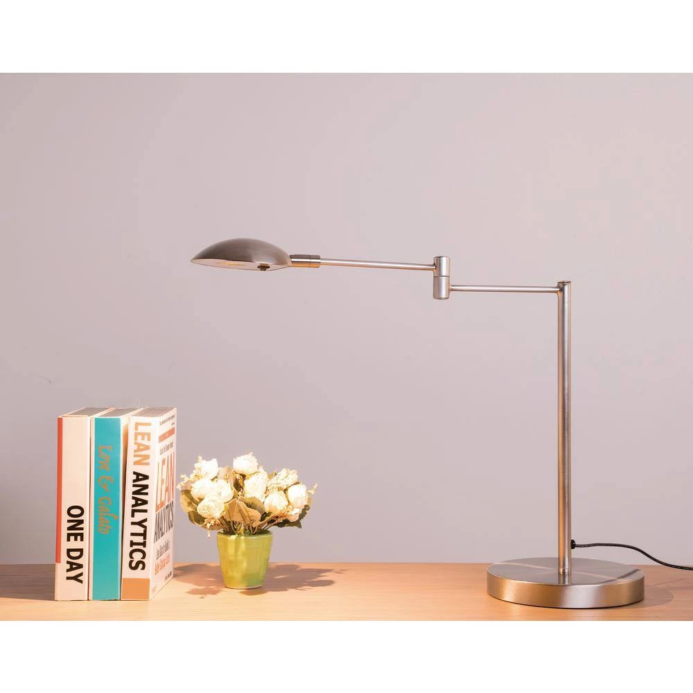 The 15.75 in. swing arm Luna satin steel LED desk lamp is ideal for a bedroom, office, college dorm, or school desk. The lightweight metal swing arm desk lamp features an adjustable Dome saucer metal shade, allowing easy positioning in any direction. Counter-Clockwise adjustable 340° swing arm for optimum convenience. This swing arm desk lamp is ideal for reading, studying, or detail, craft, or hobby activities. It helps reduce eye strain and offers better visual clarity, particularly for sharper details and small print. The light source is perfect for illuminating a small area in an office, dorm, or bedroom. The lamp features a convenient on and off button switch located visibly under the dome saucer shade. Integrated LED fixtures come complete with the LED arrays already built into the fixture. They are designed to provide a specific color and Lumen output and they do not have typical bulbs that can be replaced. Integrated LED fixtures typically last for many years, often a decade or more. Minor Assembly Required.