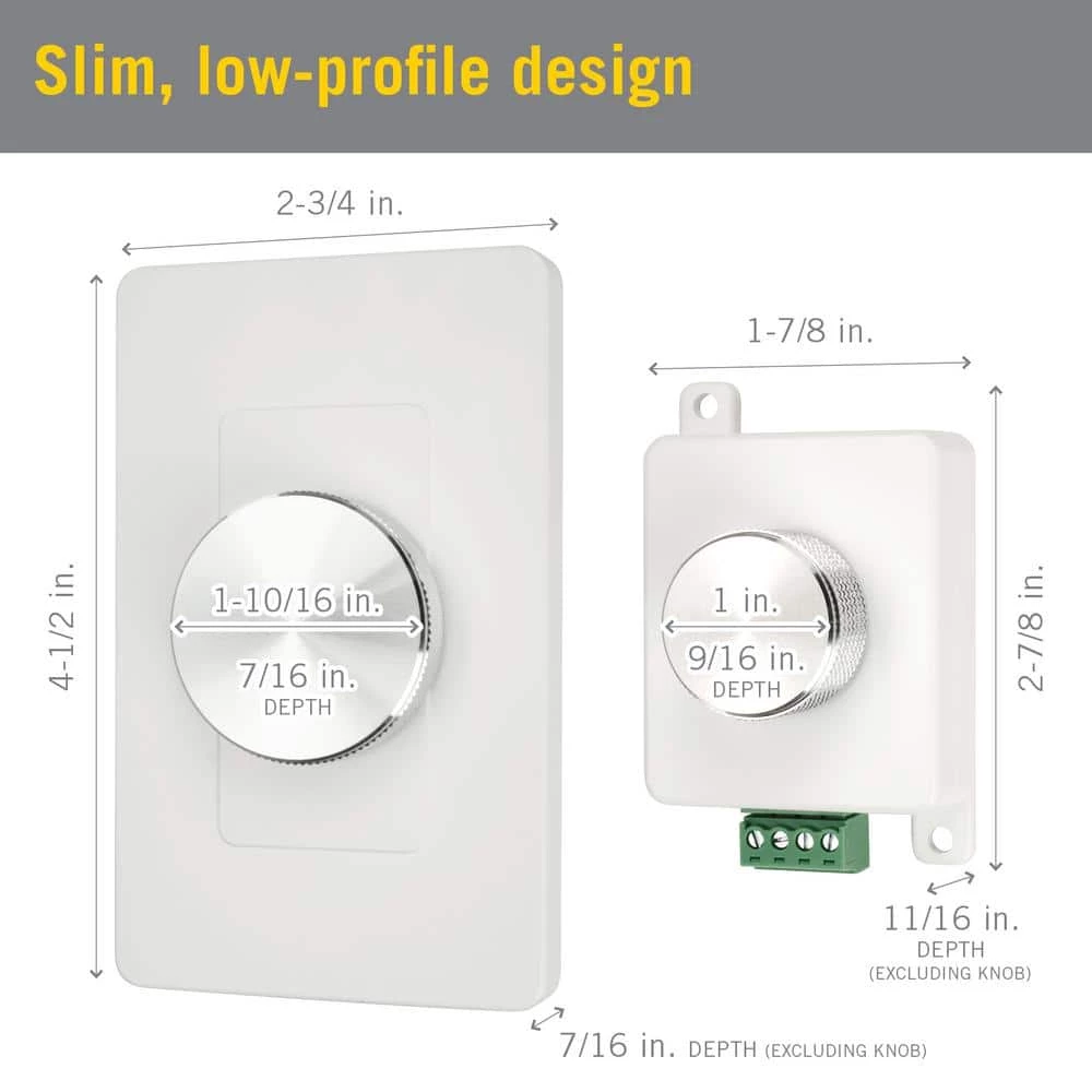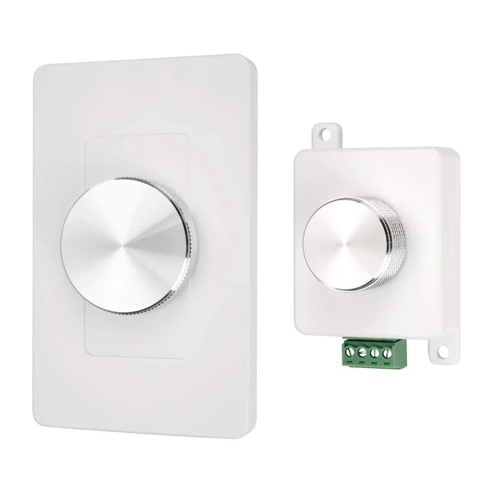 The ProLine Rotary Knob LED Dimmer from Armacost Lighting works with 12-Volt or 24-Volt DC white or single color LED lighting to provide smooth and flicker-free 0-100% dimming. Ideal for your under cabinet or accent LED lighting project. The slim, low-profile dimmer comes with 2 rotary knob choices and face and mounting plates for in-wall installation. The push button on/off knobs allow you to save your preferred dimming level. Couple with the Armacost Lighting Wall-Mount Wireless Touchpad (item#523121, sold separately) for completely wireless, RF dimming control of your LED lighting. Not for use with 120-Volt or multi-color LED lighting.