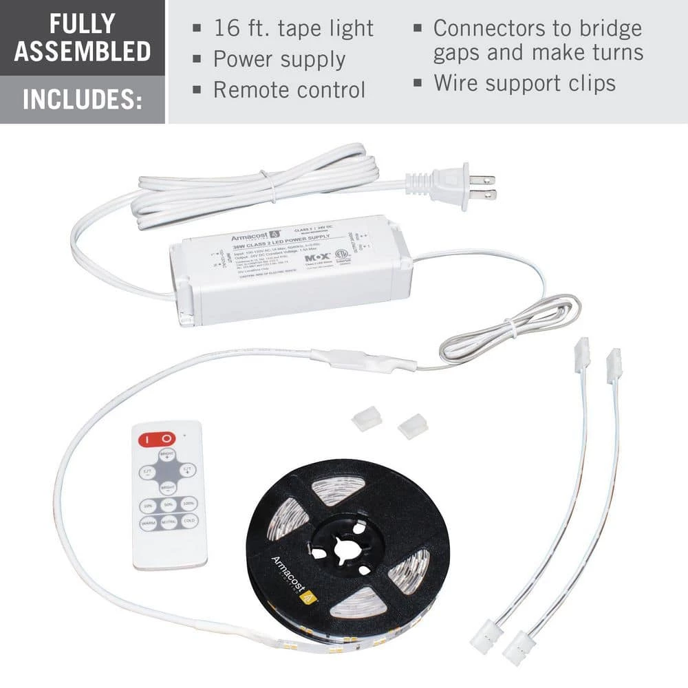 The Armacost Lighting Tunable White LED Tape Light Kit is a perfect all-around solution for any kitchen, bedroom or living room installation. The strip light kit features selectable color temperatures between soft white 2700K and bright-white 5000K options. Using the included RF (Radio Frequency) remote the LED light kit is fully dimmable from 100% to 0% brightness. Control up to three kits with a single remote for larger, custom installations. Cannot be used with AC dimming switches.