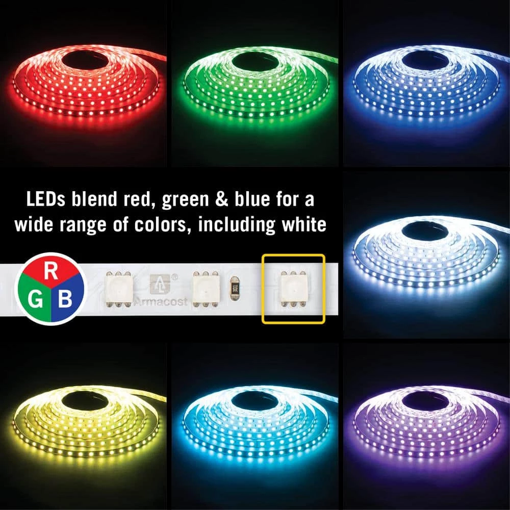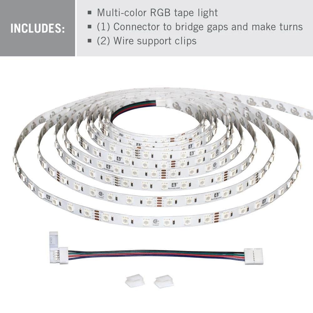 Armacost Lighting’s RibbonFlex Home Multi-Color LED Tape Light is an easy-to-use solution for a variety of under cabinet, accent, or decorative lighting projects. Illuminate any room, hallway, or surface with the flexible, color changing adhesive strip lights. High performance RGB LEDs are dimmable and produce a wide array of colors, including shades of white, making them versatile and customizable. Tape light can be used as-is or cut to size for custom installations. Cut strip pieces can be securely reconnected using the included tape connector to extend length or go around corners. Includes: Multi-color RGB LED tape light, 1 SureLock Wire Lead Connector to bridge gaps and make turns, 2 peel-and-stick wire support clips, 2 low-voltage power wire leads (one on each end), detailed Planning & Installation Guide