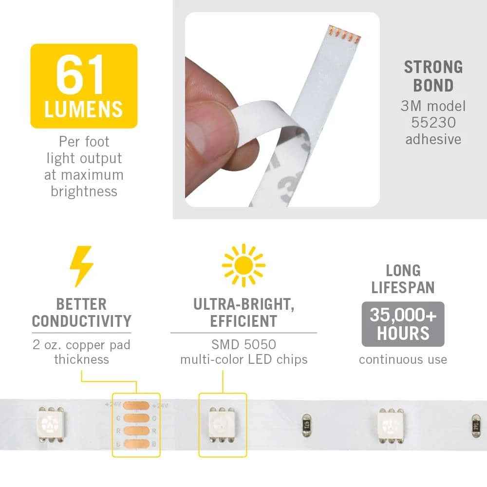 - Rated for 35,000-hours of continuous use, the energy efficient LED strip lights use 24-Volt low-voltage power