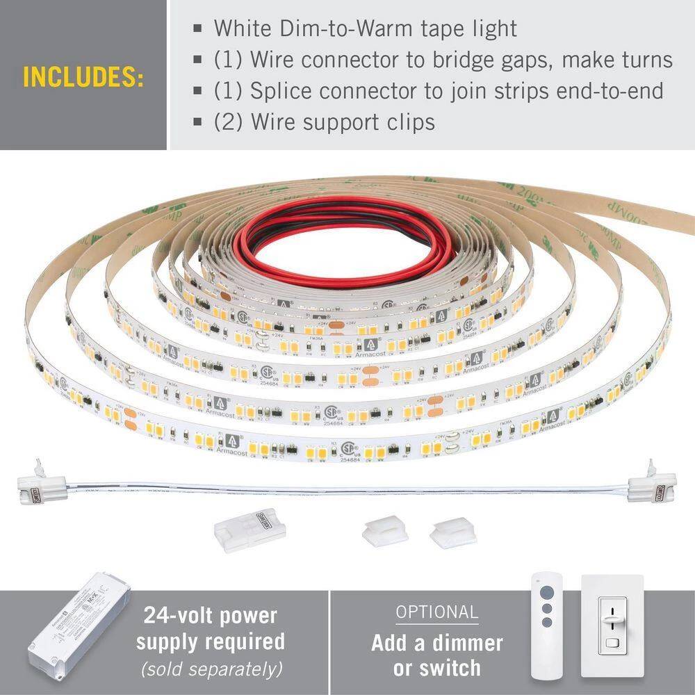 RibbonFlex Pro 24-Volt White Dim-to-Warm LED Tape Light from Armacost Lighting is a unique solution for LED accent lighting installations where a warm glow dimming effect is desired, including under cabinet, bedroom, bathrooms or living rooms. Take your lighting installation to the next level with Dim-to Warm technology, which automatically warms the white LED lights from 3000K to 1800K as they are dimmed. Pair with a low-voltage LED dimmer, such as the ProLine White or Single Color LED Controller (sold separately). These LED strip lights are designed to meet lighting professional’s layout and installation needs and feature long-lasting quality, professional-grade components that create a premium look.