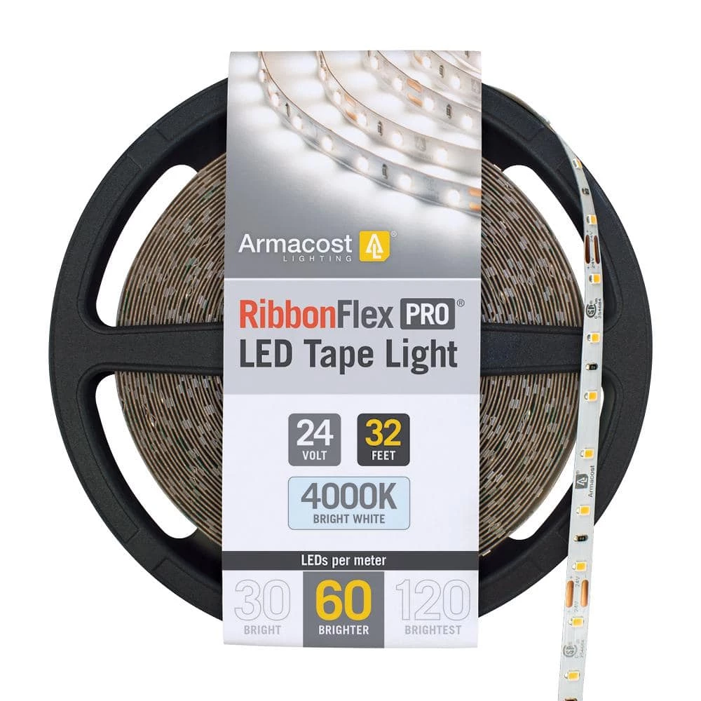 Armacost Lighting’s RibbonFlex Pro 24-Volt LED Tape Light is perfect for large LED lighting projects. Ideal for a variety of accent lighting applications, including above or under cabinet lighting, tray ceiling lighting and shelving lighting. These LED strip lights are designed to meet the layout and installation requirements of lighting professionals and feature high quality, professional-grade components that are longer lasting and create a premium look. Featuring peel-and-stick 3M adhesive backing for a long-lasting, permanent hold. LED strip lights require a 24-Volt power supply (sold separately). 60 LEDs per meter provide a brighter light, good for general purpose lighting.
