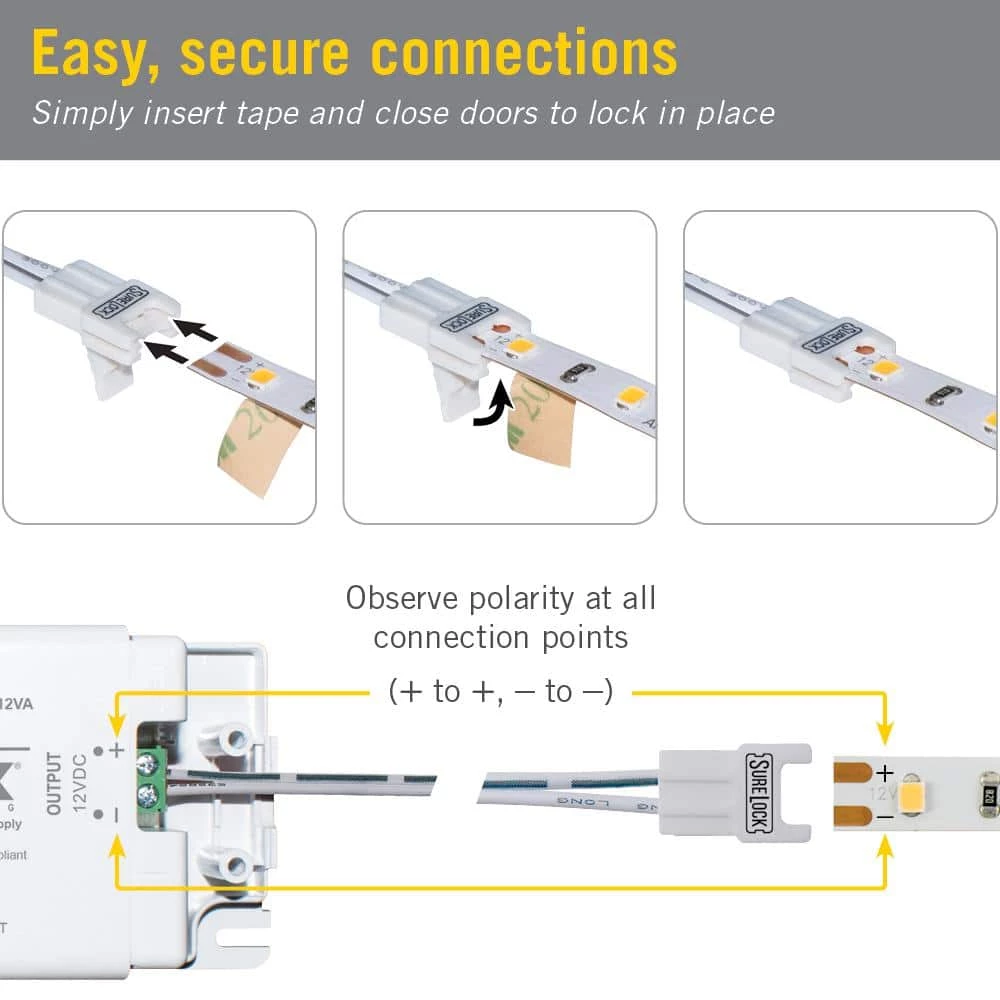Use SureLock Tape to Wire Connectors from Armacost Lighting for connecting low voltage power wires to white LED tape strips or as a jumper cable when extending LED tape lighting to different areas. The 48 in. lead wire is perfect for connecting LED tape light that is to be installed as undercabinet lighting to a power supply that is situated on op of the cabinet. Perfect for solderless connections.