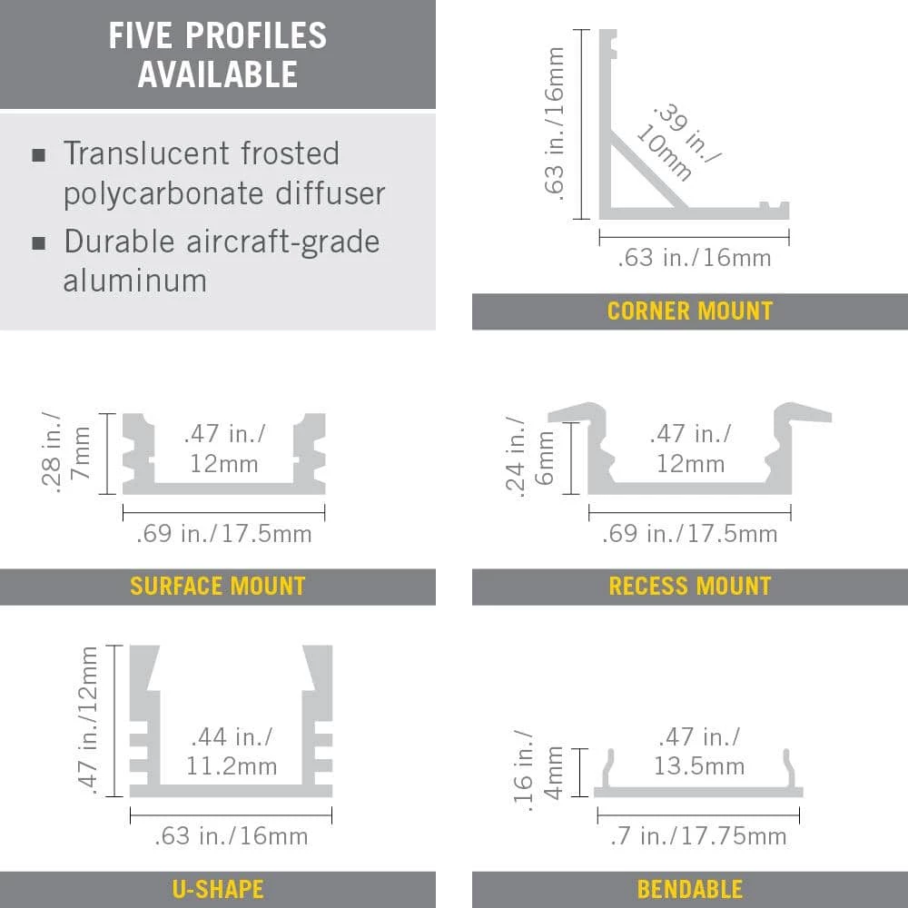 - Flat profile for surface or recessed installations, corner profile for 45° directional lighting